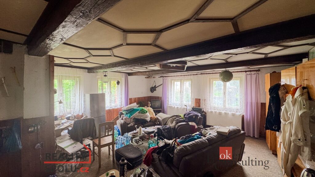 Dům je v zanedbaném a neobyvatelném stavu – sedlová střecha (tašky typu bobrovka) je poškozena a do objektu zatéká, zdivo nese známky vlhkosti, interiér je neudržovaný.