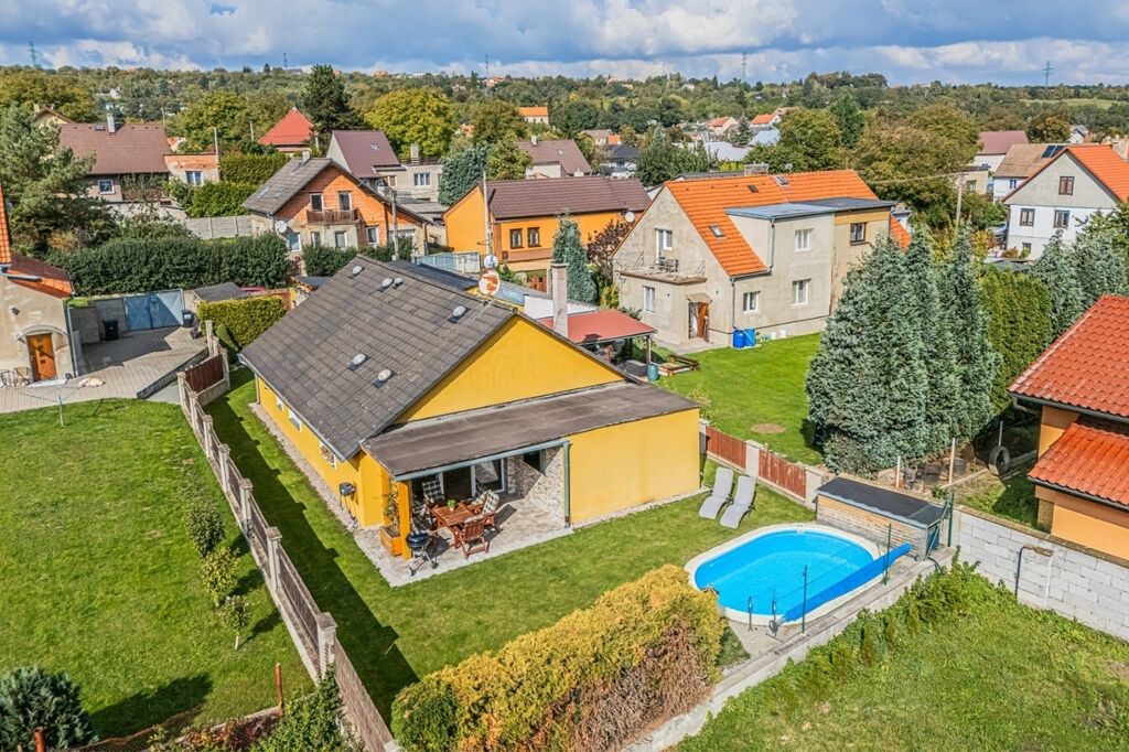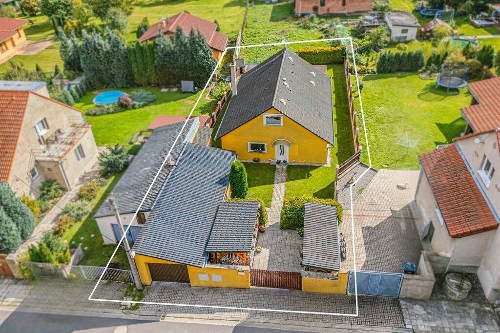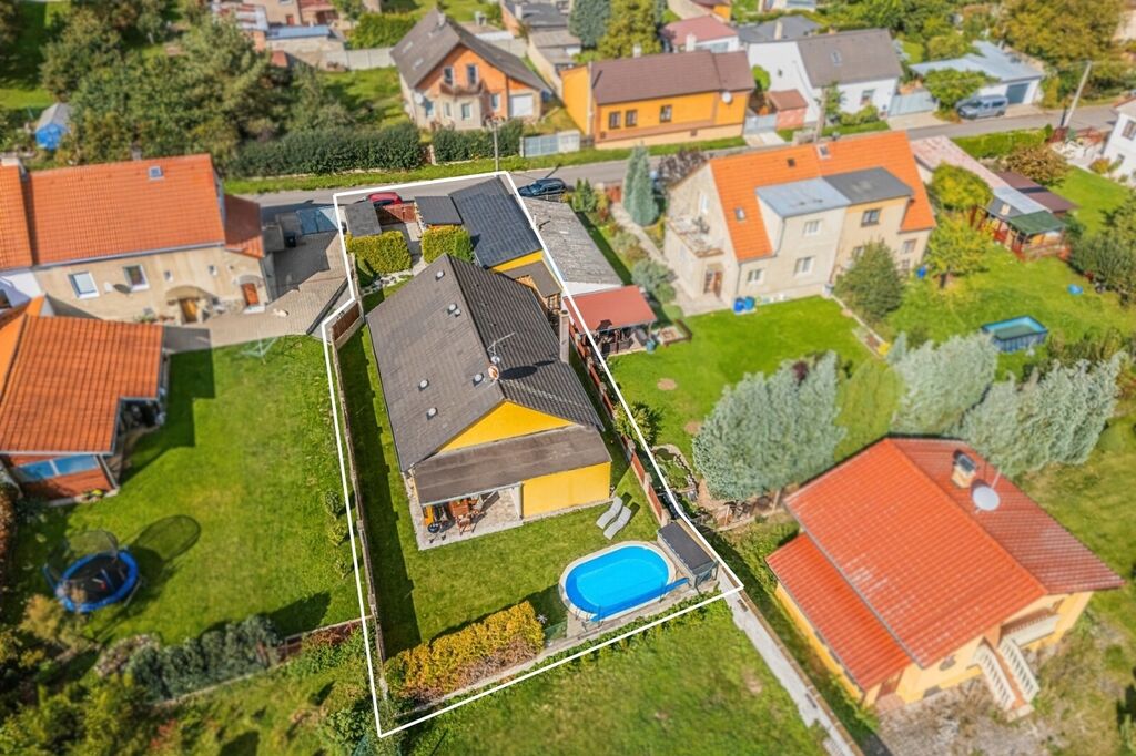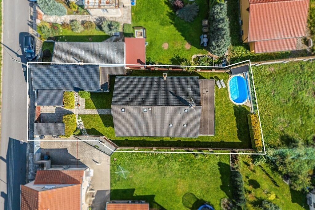 Na pečlivě udržované zahradě se nachází zapuštěný bazén a u něj malá dílna pro uložení zahradního náčiní. Součástí pozemku je dvougaráž, případně garáž pro jedno auto s dílnou, o celkové ploše 33,6 m². Parkování pro další dvě vozidla je možné pohodlně u pozemku. Zahrada je rovinatá, osázená okrasnými keři, se zpevněnými plochami ze zámkové dlažby a k zalévání slouží voda ze studny. Měsíční náklady na provoz domu jsou do 5.000,- Kč.