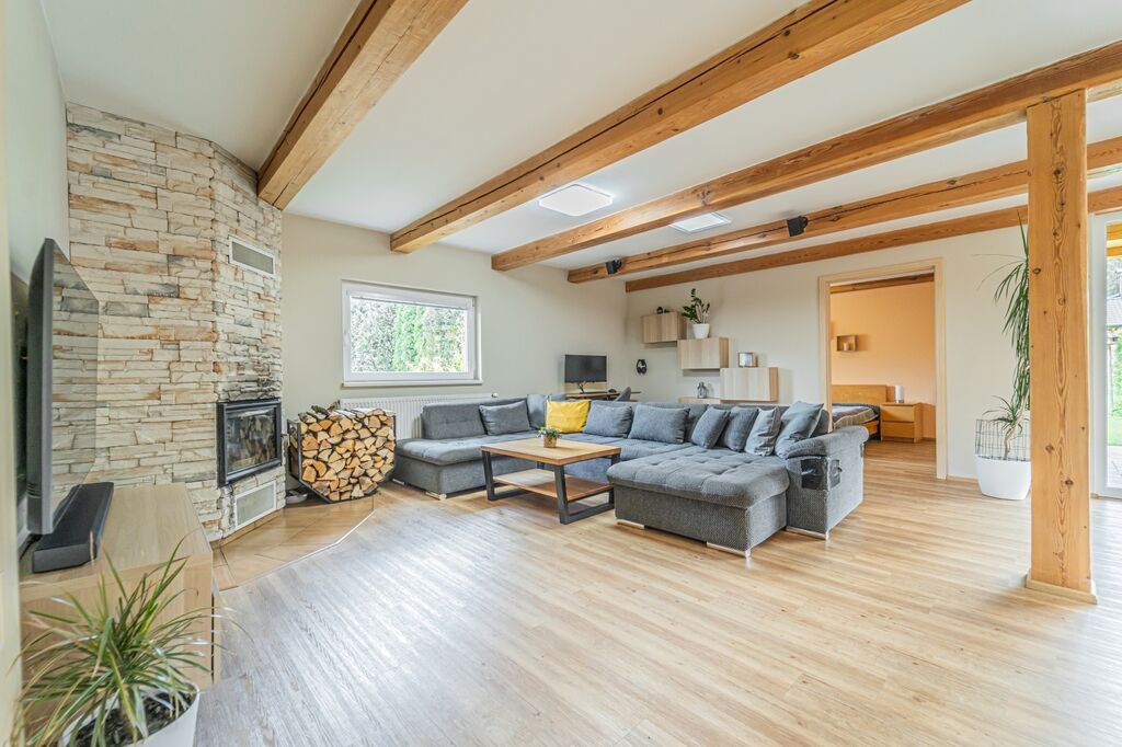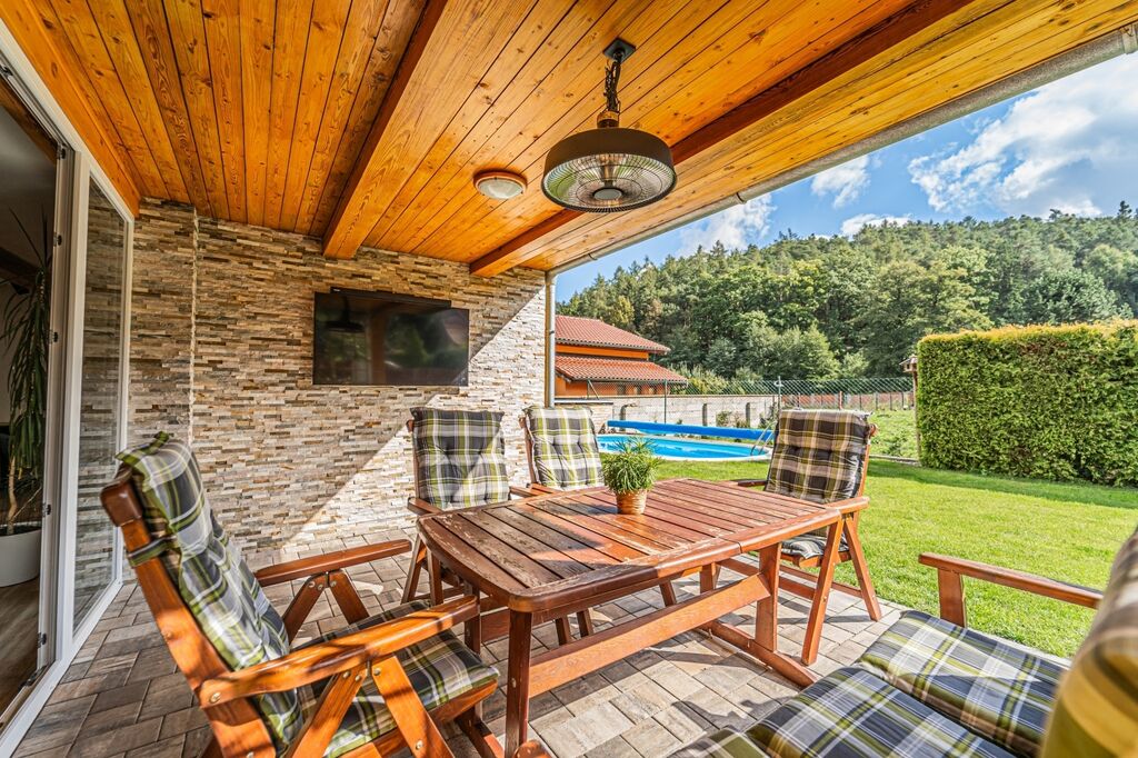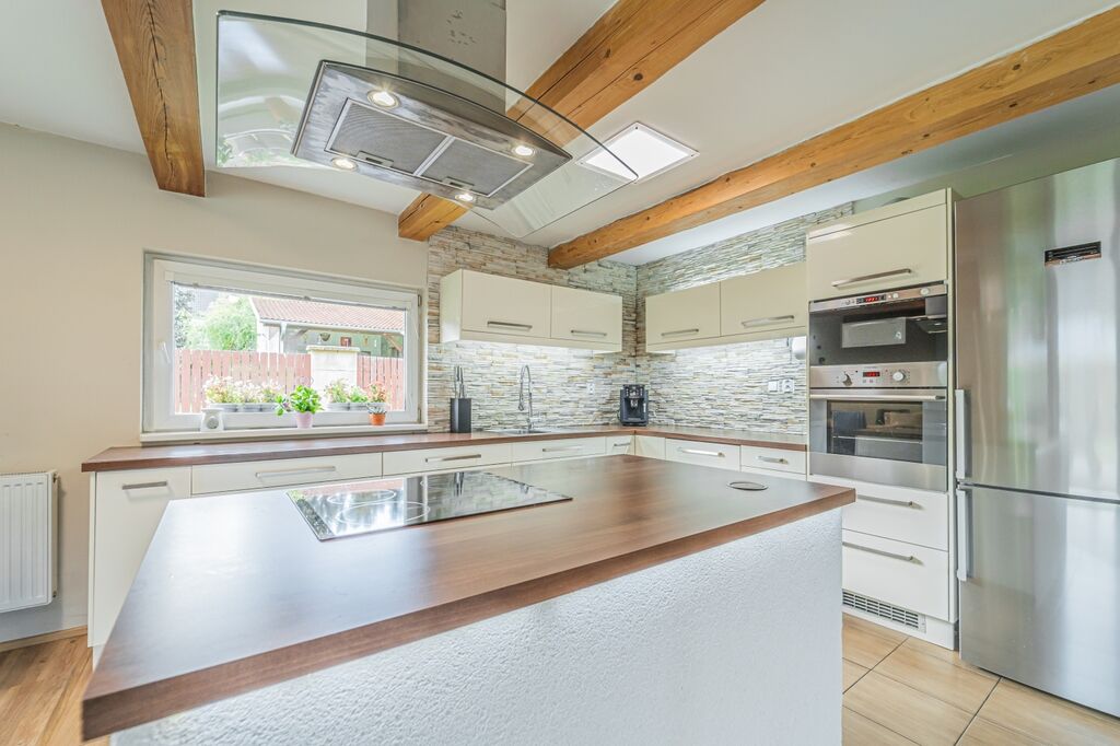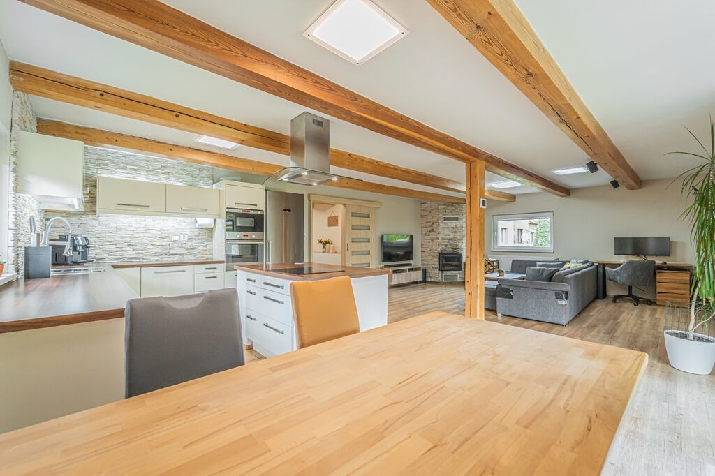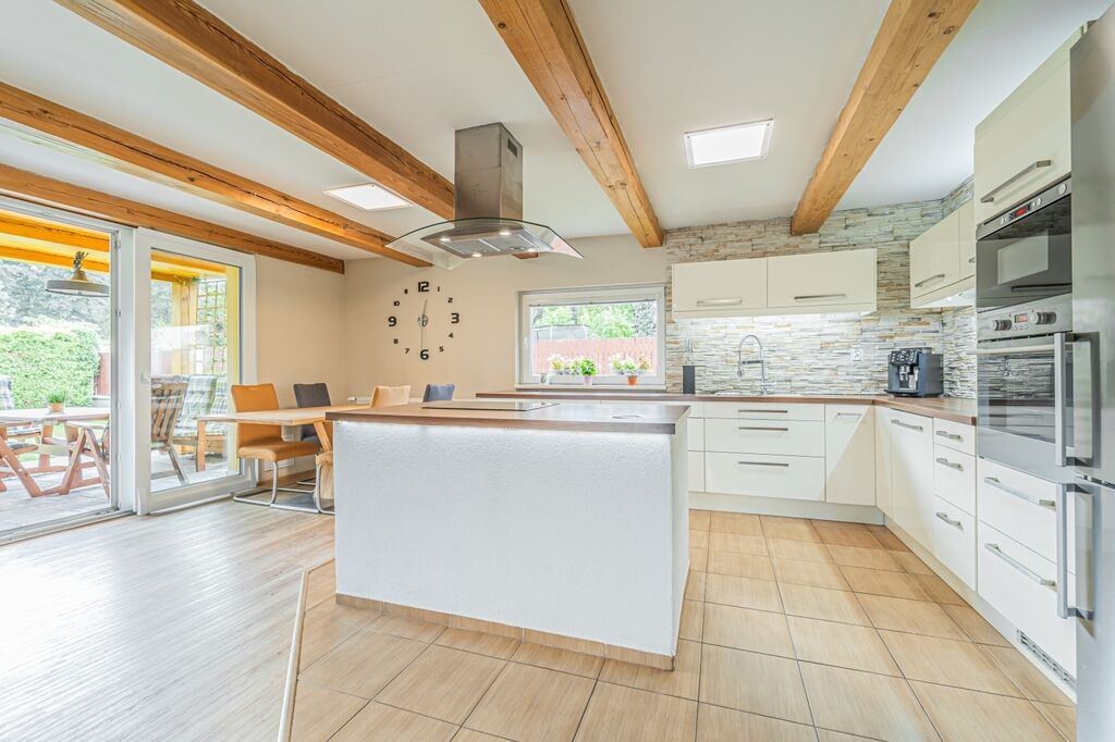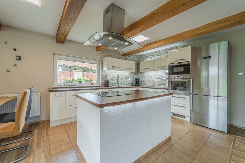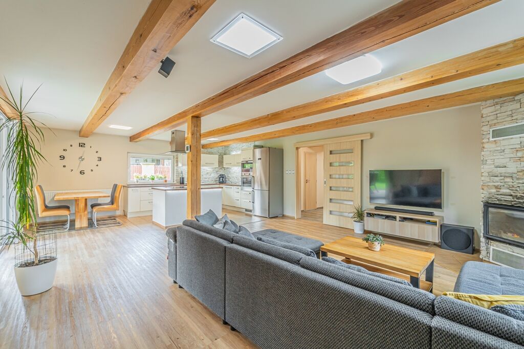 Dispozici tvoří tři ložnice a velkorysý obývací pokoj s krbovými kamny a průchodem do jídelny a kuchyně. Kuchyň je řešena do „L“ s ostrůvkem a indukční varnou deskou, nad ní je designová ostrůvková digestoř; k dispozici je vestavná trouba a mikrovlnná trouba. Z jídelny se přes francouzské dveře vychází na krytou terasu s posezením a TV, která plynule navazuje na udržovanou zahradu.
