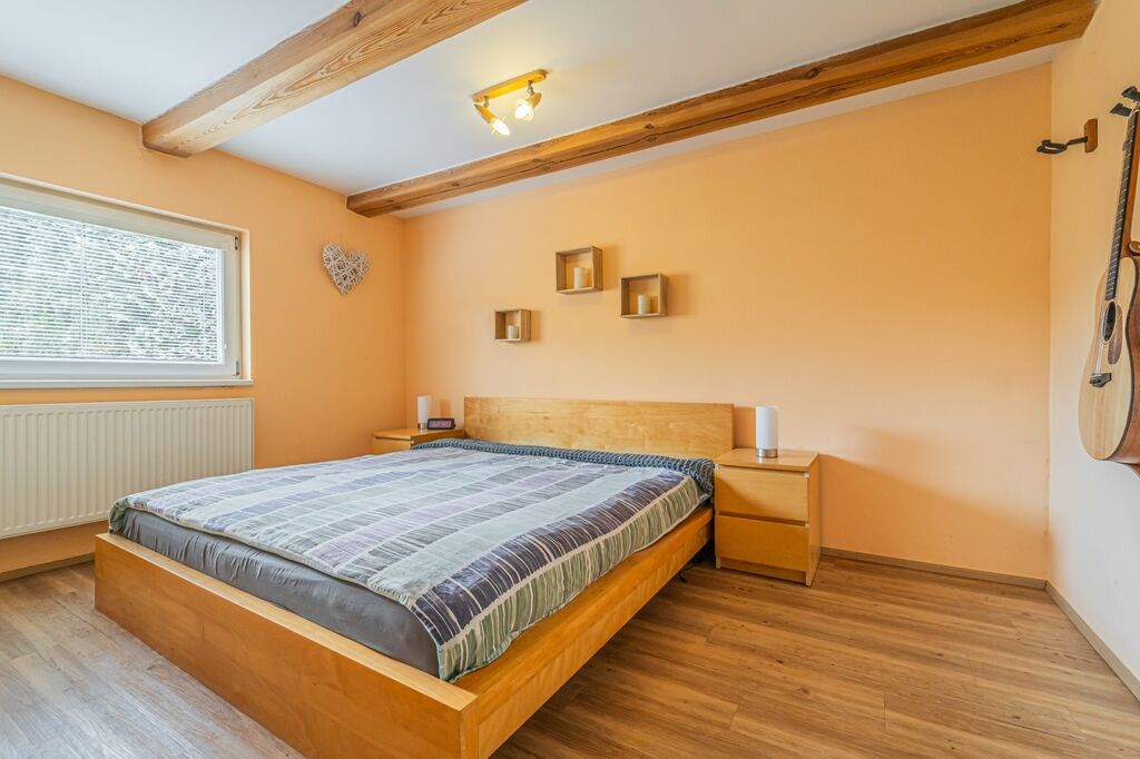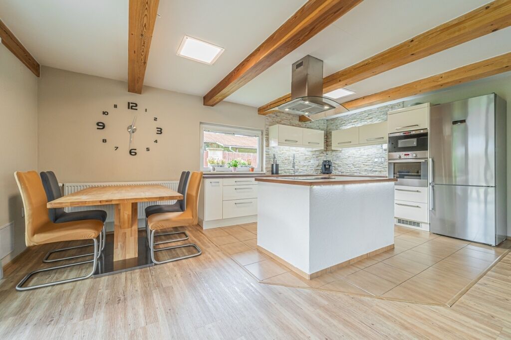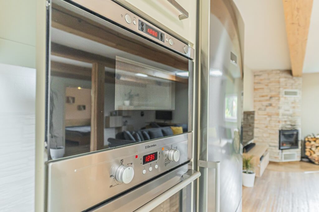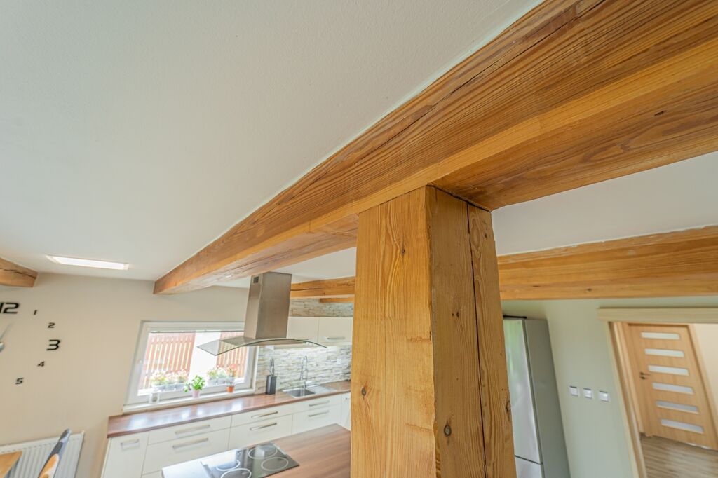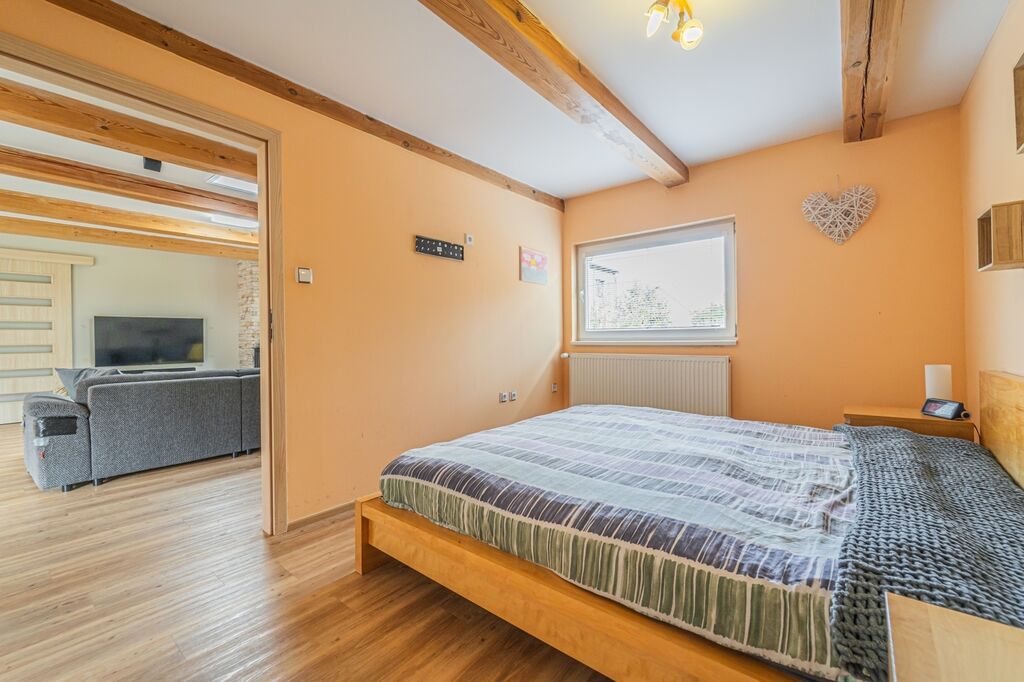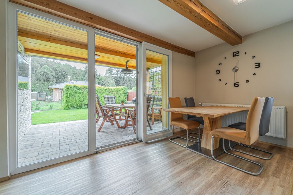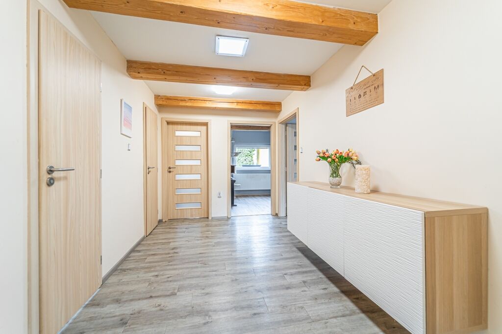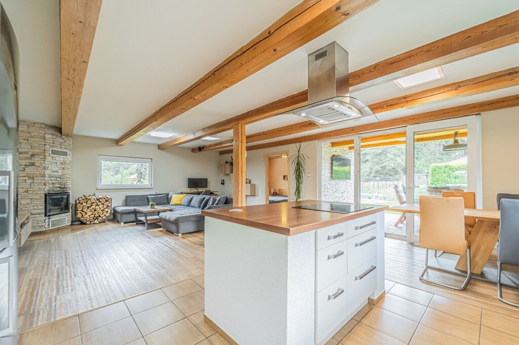 Dispozici tvoří tři ložnice a velkorysý obývací pokoj s krbovými kamny a průchodem do jídelny a kuchyně. Kuchyň je řešena do „L“ s ostrůvkem a indukční varnou deskou, nad ní je designová ostrůvková digestoř; k dispozici je vestavná trouba a mikrovlnná trouba. Z jídelny se přes francouzské dveře vychází na krytou terasu s posezením a TV, která plynule navazuje na udržovanou zahradu.