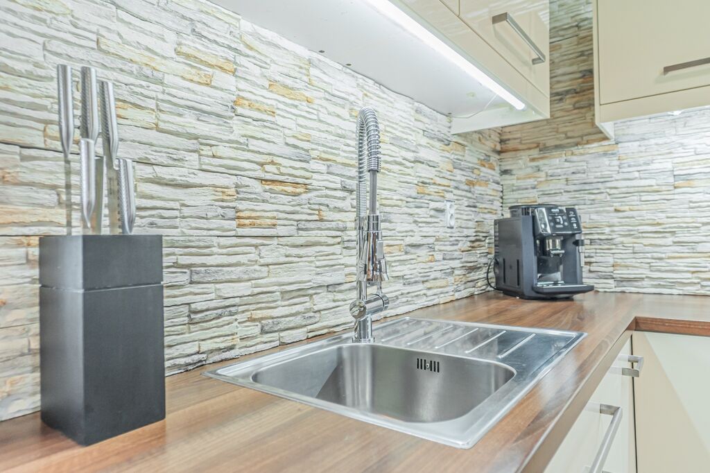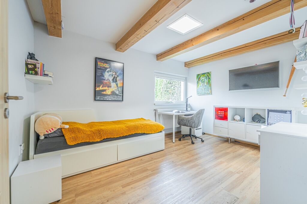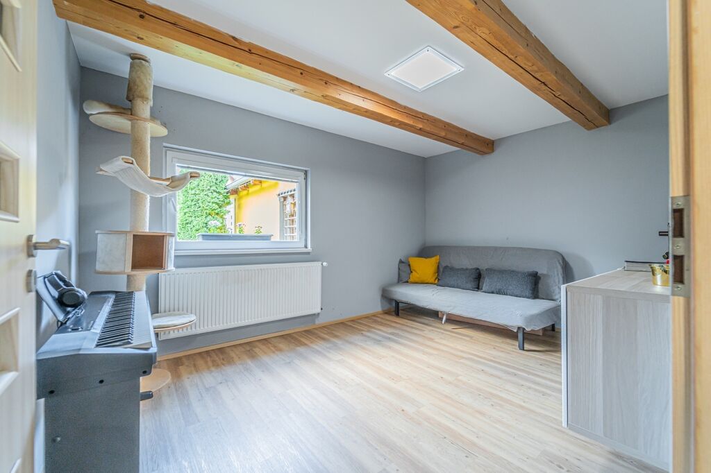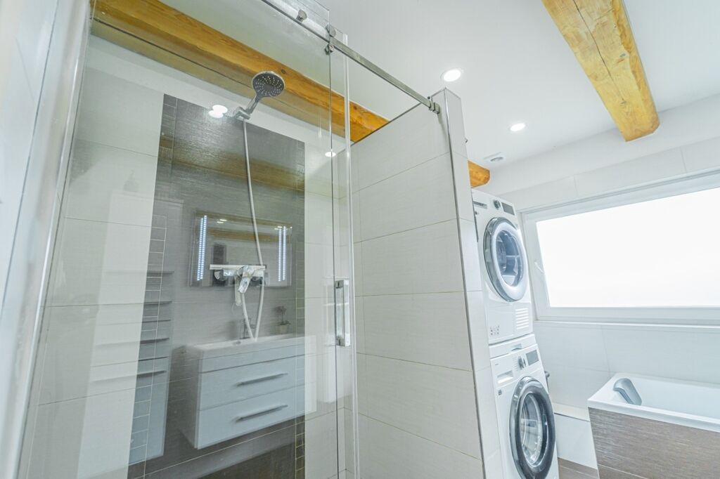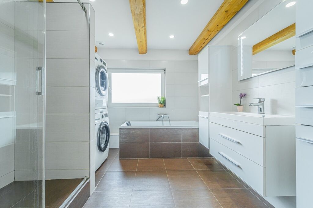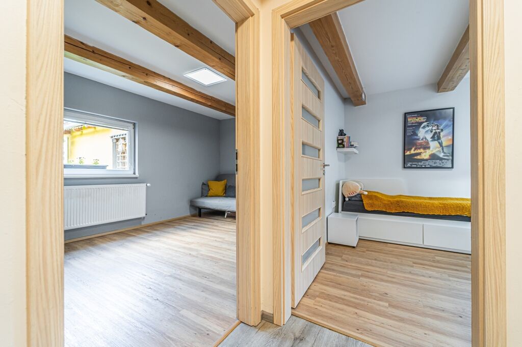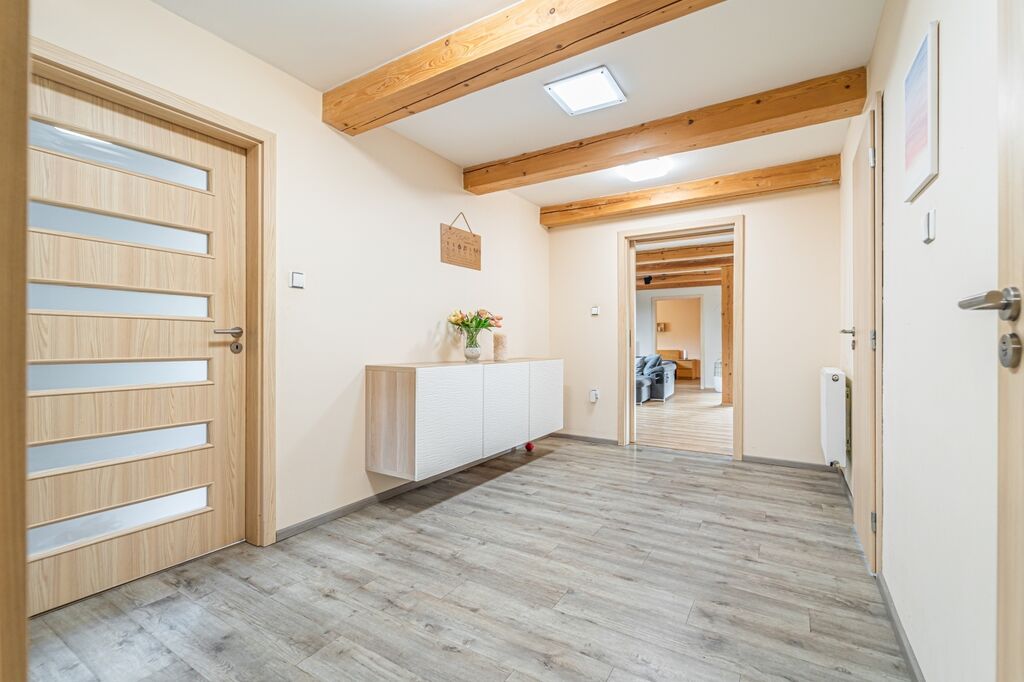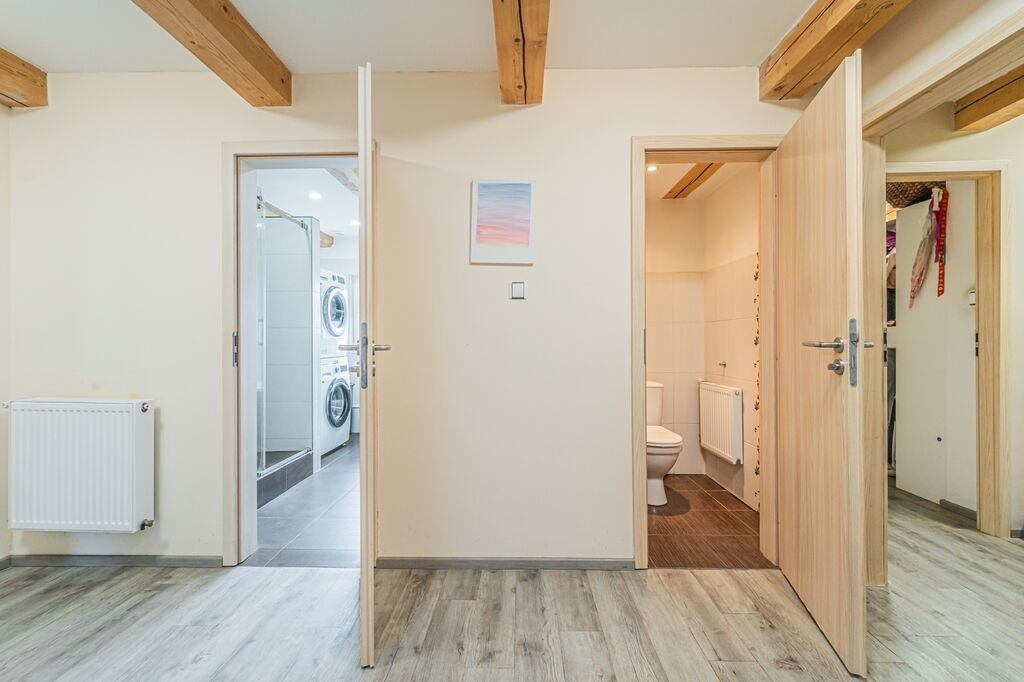 Koupelna nabízí sprchový kout i vanu, velké úložné skříňky a pračku se sušičkou lze uspořádat nad sebe; toaleta je samostatná. V obytných místnostech je kvalitní vinylová podlaha. V kuchyni, v koupelně, na WC, v zádveří a v technické místnosti je keramická dlažba. Ze šatny je přístup na půdu využívanou jako praktické úložiště.