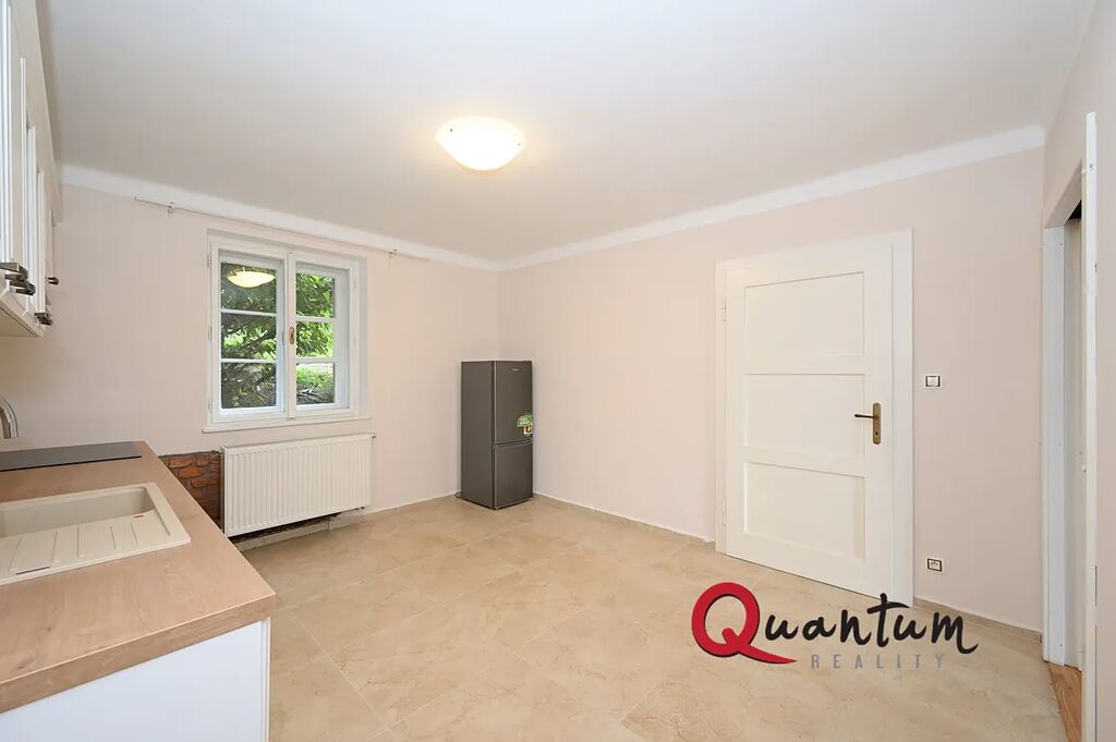 Ze zádveří je přístupná kuchyně 14,8 m2 s novou kuchyňskou linkou vybavenou sklokeramickou varnou deskou, horkovzdušnou troubou, digestoří a pračkou, lednice je samostatně. Na podlaze je praktická dlažba. Z kuchyně se vstupuje do pokoje 15,6 m2 s krásným výhledem do zahrady a do údolí, na podlaze jsou modřínová prkna. Koupelna, se sprchovým koutem, topným žebříkem a bílým koupelnovým nábytkem, je prosvětlena oknem. Toaleta s umývátkem je samostatná.
