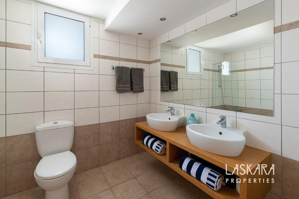 Interiér o rozloze 168 m² působí svěže a přirozeně. V přízemí se nachází otevřený obývací prostor s plně vybavenou kuchyní a jídelnou, zatímco v patře jsou tři komfortní ložnice a dvě koupelny s dvojumyvadly. Z hlavní ložnice vede balkon s výhledem, který připomíná pocit bezčasí – pohled na moře, který se neomrzí.