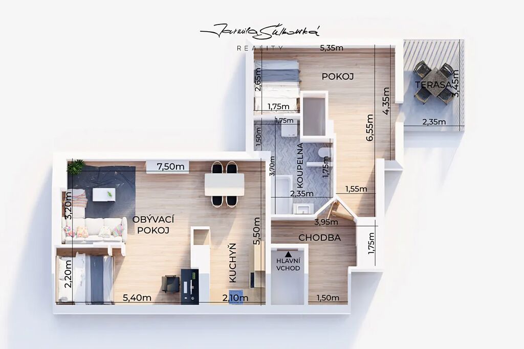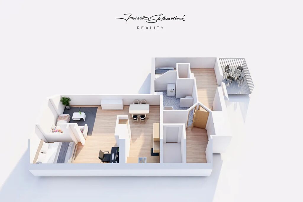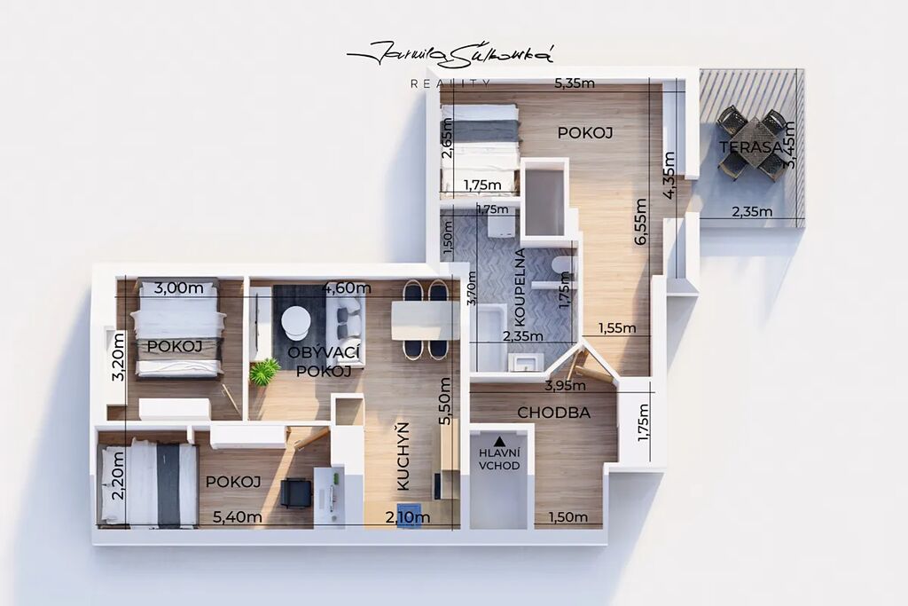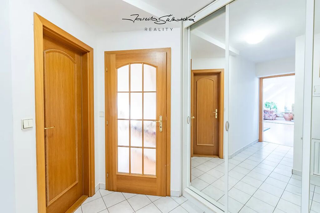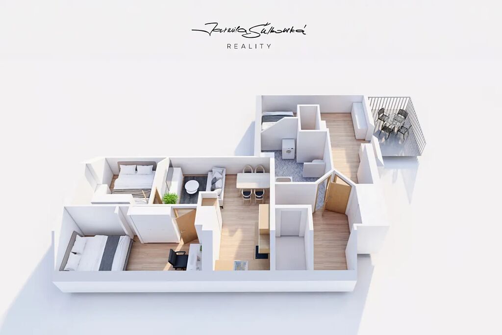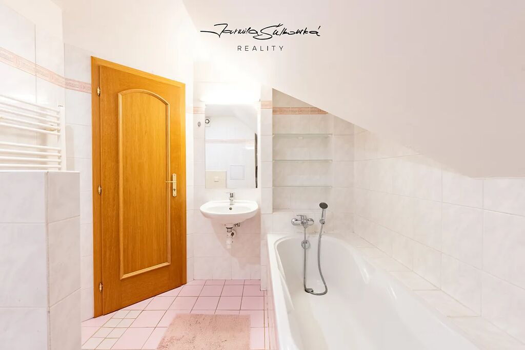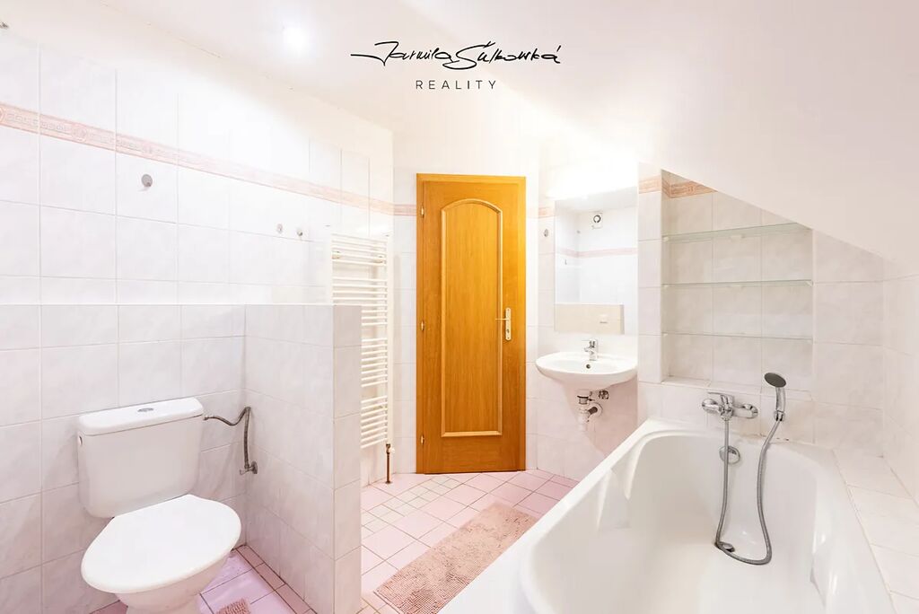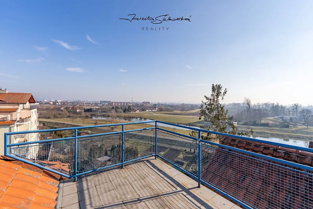 Další pokoj téměř 25 m2 je na opačné straně bytu s přímým vstupem na terasu. Terasa o rozloze 7,5 m2 s orientací na jihovýchod nabízí naprosté soukromí a klid a budete si zde užívat pohodu a výhledy na Svatý Kopeček, řeku Moravu a zeleň po celý den a bez sousedů. Koupelna s vanou a toaletou má téměř 10 m2. Je zde prostor i pro umístění pračky. Na chodbě jsou dvě vestavěné skříně a dostatek úložných prostor. Rozměry jednotlivých místností dle přiložené vizualizace a půdorysů.