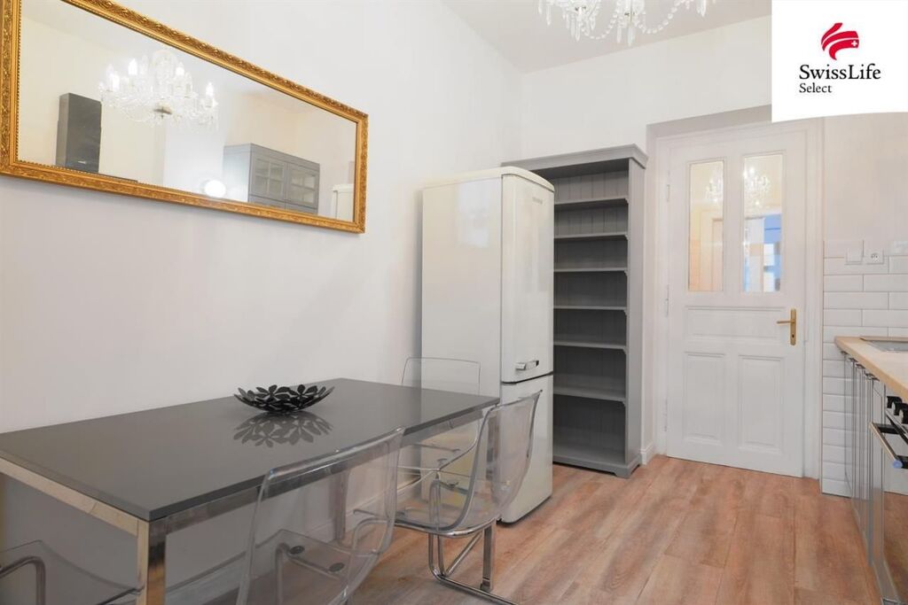Interiér působí vzdušně a zachovává původní historické prvky - vysoké stropy a kvalitní parkety.