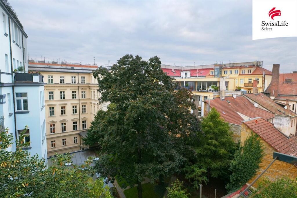 Výhledy, které stojí za to. Z bytu vidíte nejen do klidné ulice Na Zderaze a na pravoslavný barokní chrám svatého Cyrila a Metoděje, ale i do zahrad vnitrobloku a na Petřínskou rozhlednu.