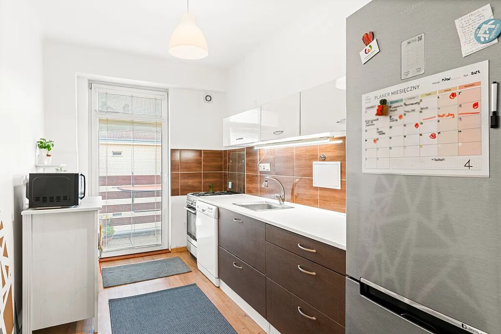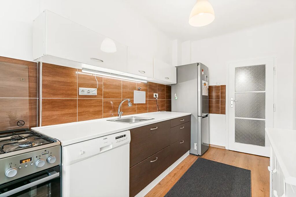 Dispozice: vstupní chodba, koupelna se sprchovým koutem a pračkou, samostatná toaleta, obývací pokoj, ložnice a kuchyně. Kuchyň je vybavena lednicí, myčkou, troubou a varnou deskou. Z kuchyně je vstup na balkon. K dispozici je také spíž (cca 1,5 m²).