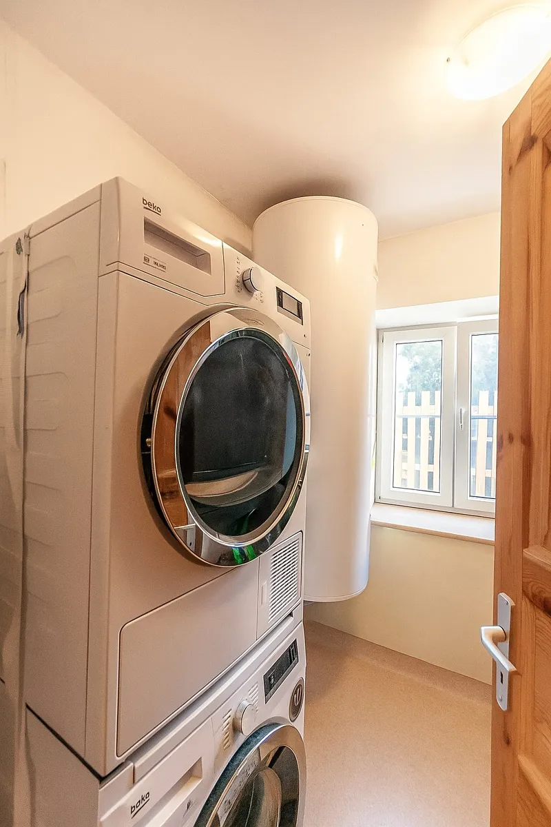 Koupelna s rohovou vanou, umyvadlem se zrcadlem a menší kuchyní s přípojkou na pračku a sušičku podtrhují rodinnou atmosféru a pohodlí.
