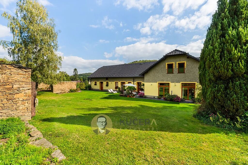 Ve vzrostlé zahradě o rozloze 7 360 m² stojí prostorný rodinný dům ve tvaru písmene L, který prošel kompletní rekonstrukcí. Součástí této nabídky jsou také pozemky o rozloze 144 925 m², které lze využit pro rekreaci, chov zvířat, vlastní les nebo čistě jako investici.