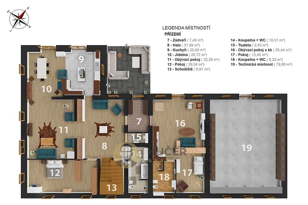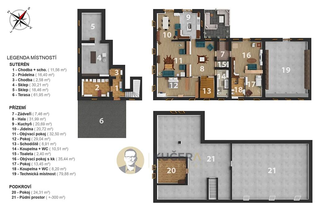 - prádelna 16 m², technická místnost 80 m², sklep 64 m²