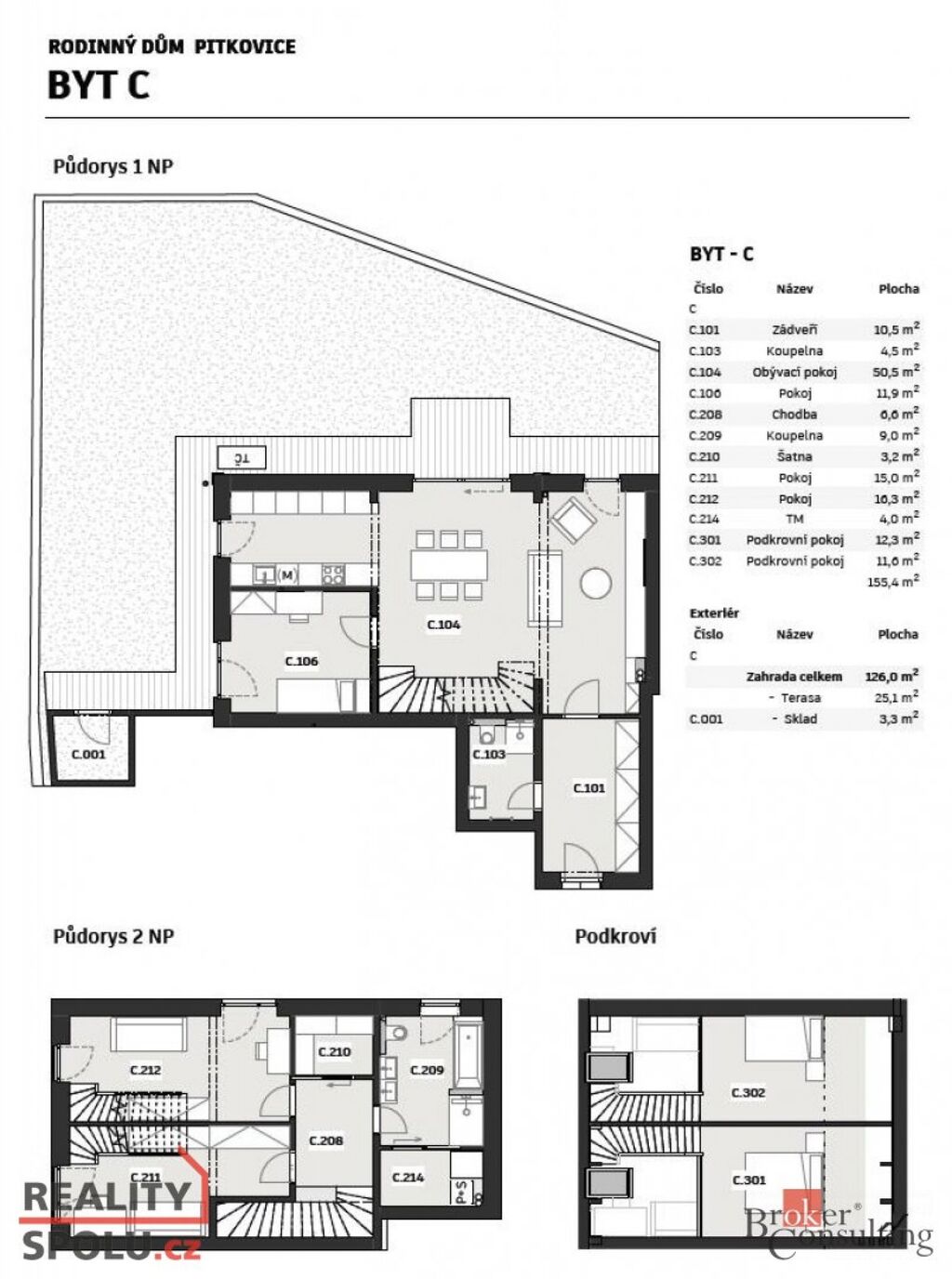 Byt  je řešen jako mezonetový byt o užitné ploše 155,4 m², se zahradou 126 m², terasou 25 m² a zahradním skladem 3,3 m². K jednotce náleží dvě parkovací stání s přípravou pro nabíjení elektromobilu.
