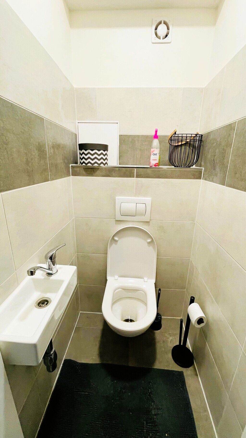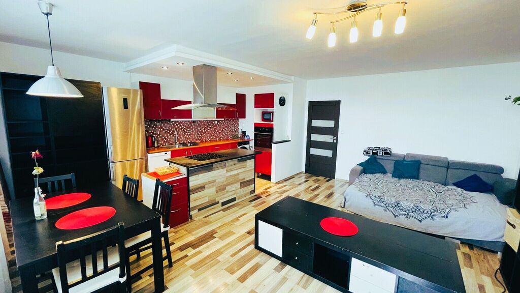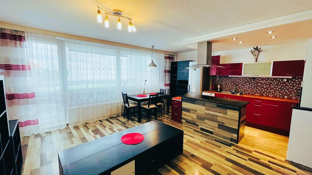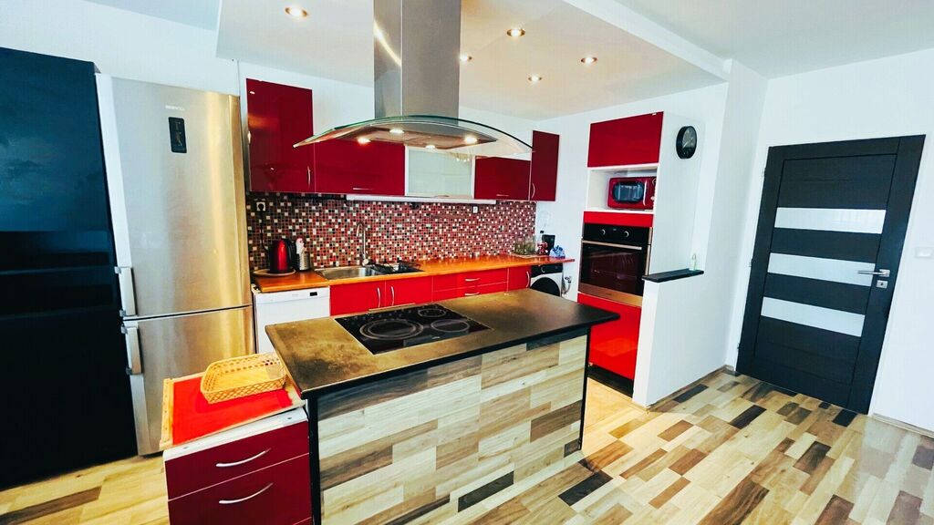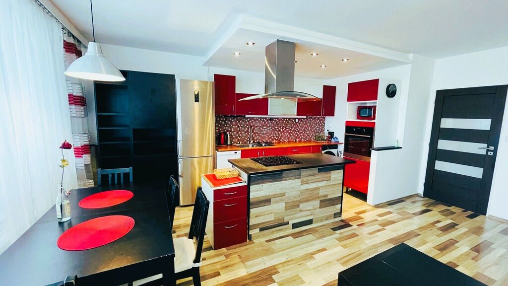• Kuchyň: moderní linka s ostrůvkem, indukční varná deska, digestoř, myčka, lednice s mrazákem, horkovzdušná a mikrovlnná trouba, varná konvice, pračka a spousta úložného prostoru.