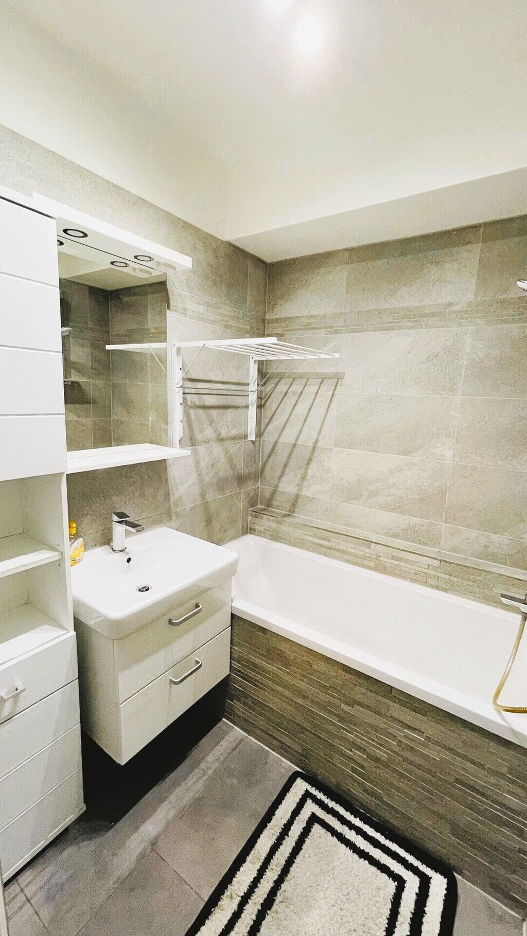 • Koupelna: vana s možností sprchování, umyvadlo s úložnou skříňkou, zrcadlová skříňka s osvětlením