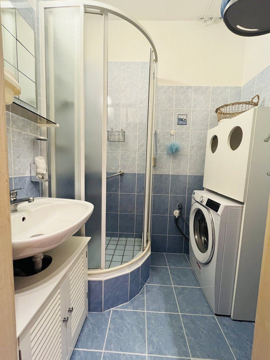 Koupelna nabízí sprchový kout a je umístěna samostatně. Najdeme zde také pračku.