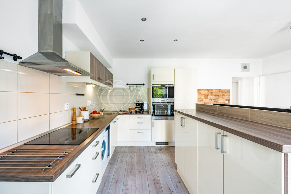 Byt je prakticky řešený – nabízí obývací pokoj s kuchyňským koutem, plně vybavenou linkou se spotřebiči (myčka, sklokeramická deska, trouba, digestoř i lednice s mrazákem).