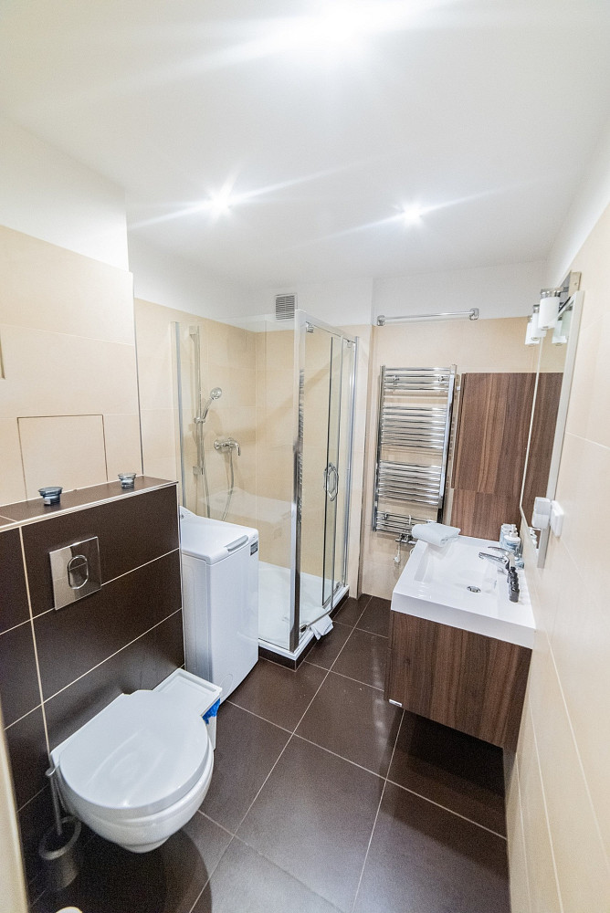Součástí vybavení bytu je veškerý nábytek včetně postele, rozkládací sedačky a spotřebičů (pračka, myčka nádobí, lednice s mrazákem, plynový sporák, elektrická trouba, digestoř, mikrovlnná trouba).
