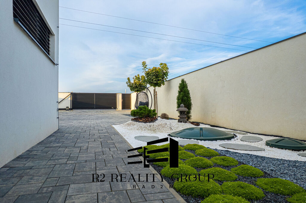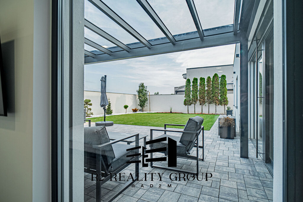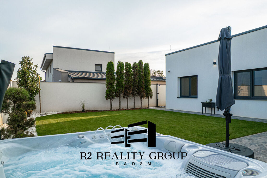 Na zahradě najdete dvě pergoly, první bioklimatickou a druhou prosklenou, která je přisazená k domu. Do WPC prken Woodplastic je zapuštěný vířivý bazén. K výbavě domu patří elektricky ovládané venkovní žaluzie. Dům je oplocen betonovým plotem a je monitorován alarmem a kamerami.