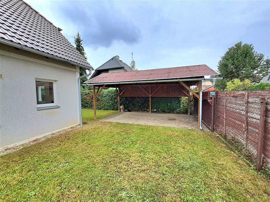 Na pozemku je přístřešek pro auto a malý zahradní domek na nářadí.