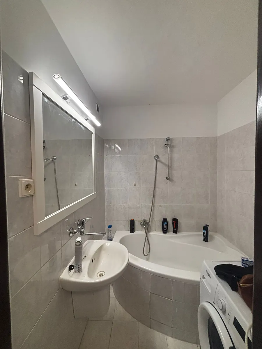 V bytě je položena plovoucí podlaha a dlažba.