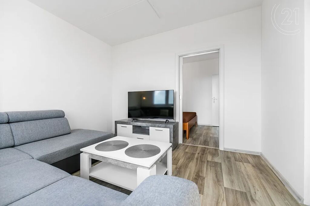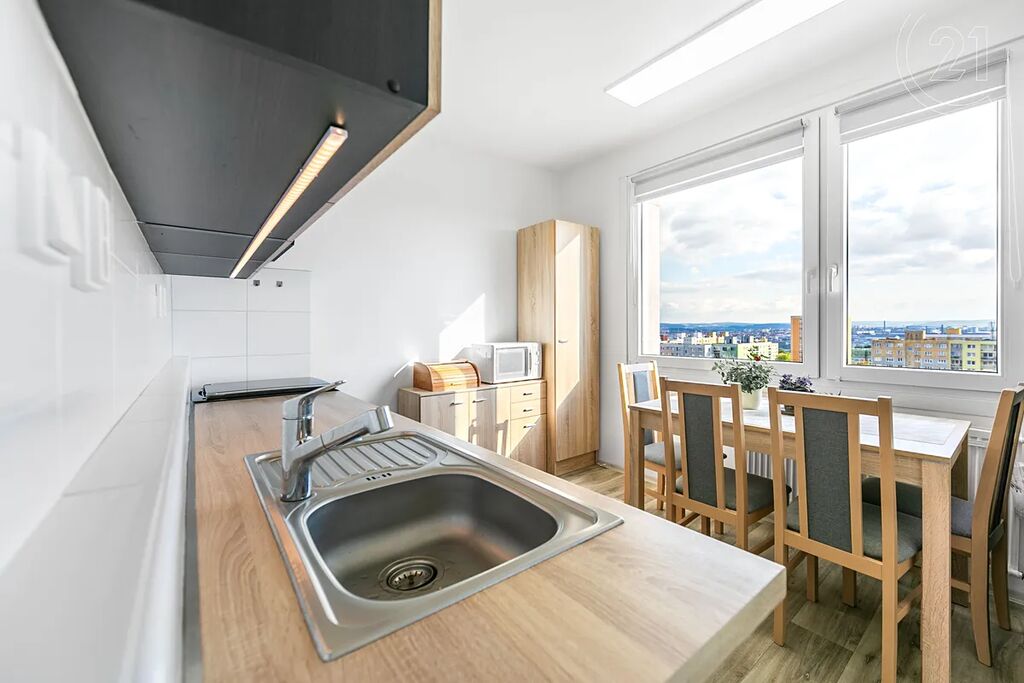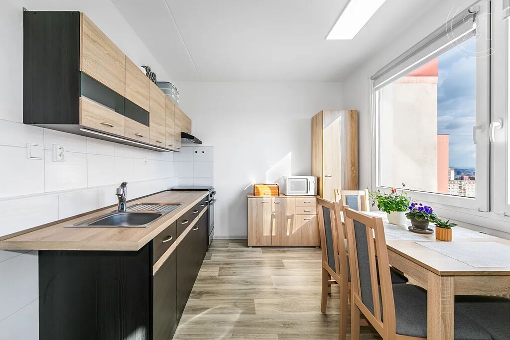 Byt se nachází v 10. patře revitalizovaného panelového domu a prošel částečnou rekonstrukcí. Je zde například již zděné jádro, nové rozvody vody i elektřiny nebo kuchyňská linka.