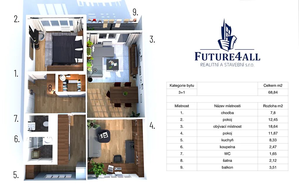 Byt je v osobním vlastnictví, zasloužil by si rekonstrukci, avšak koupelna a toaleta prošly rekonstrukcí před 7 lety. To umožňuje kombinaci okamžitého užívání a postupných úprav podle vlastních představ.