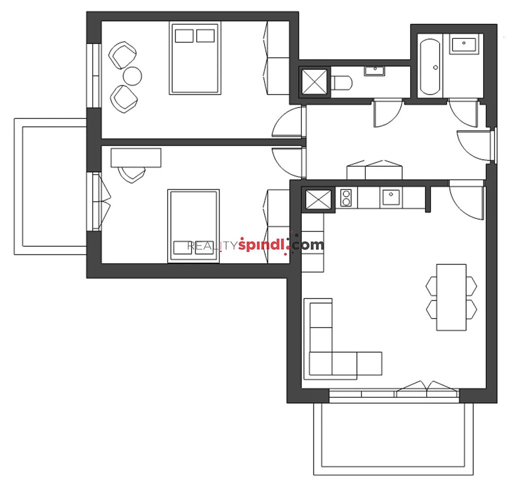 Za vstupními dveřmi jednotky se nachází prostorná předsíň, která tvoří vstupní halu do jednotlivých místností. Najdeme zde obývací pokoj s kuchyňským koutem a vstupem na jeden ze dvou balkonů, dvě ložnice (z jedné je vstup na balkon s výhledem na sjezdovku FIS World Cup), koupelnu s vanou a samostatnou toaletu s umývátkem.