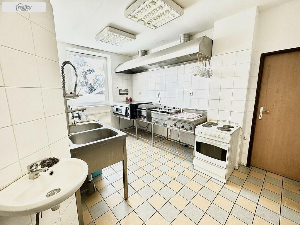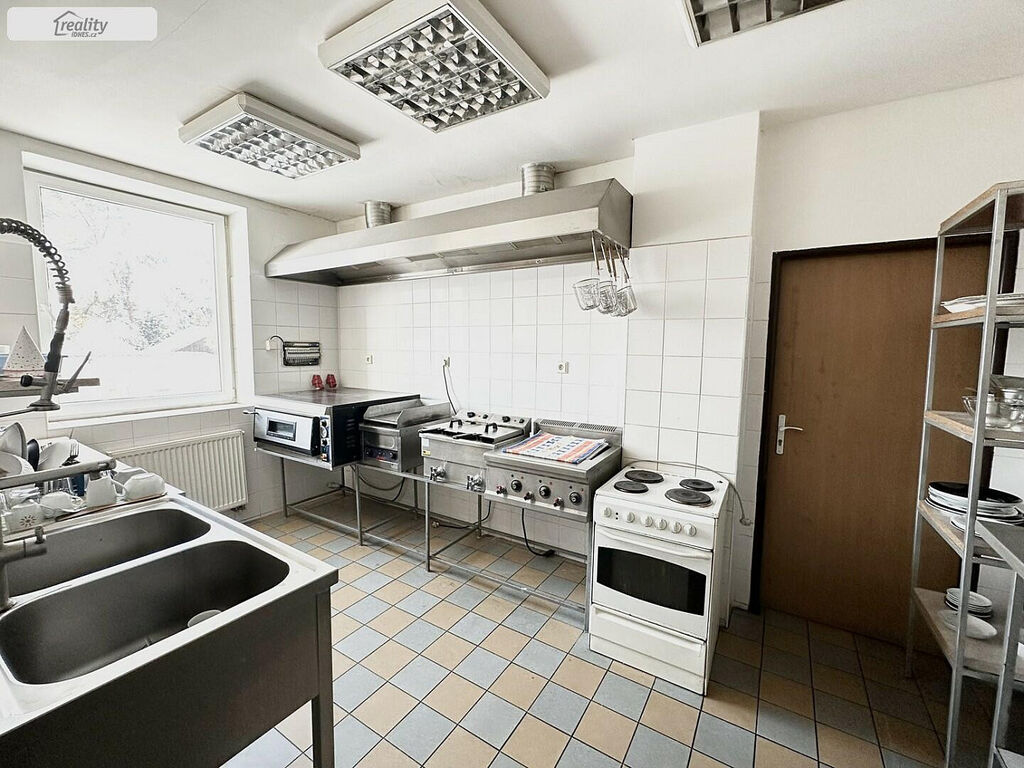 Dispoziční řešení: v 1. NP vstupní chodba, 1 část restaurace cca 10 míst a bar, 2 část restaurace cca 36 míst, salonek cca 12 míst, pánské toalety, dámské toalety, zadní vstup do prostor pro zaměstnance, ( zázemí ) dle stanov hygieny, kde je sprcha, umyvadlo a toalety pro personál, z těchto prostor určených pro personál je vstup do kuchyně, která má potřebné náležitosti schválené dle stanov Hygieny Teplice. Dále v zadní části objektu je kuchyňka sloužící pro ubytované, vchod na zadní dvůr a schodiště do sklepa a rovněž , v jiné části chodby schodiště do 2 NP a zázemí pro uklízečku, kde je také umístěna pračka.