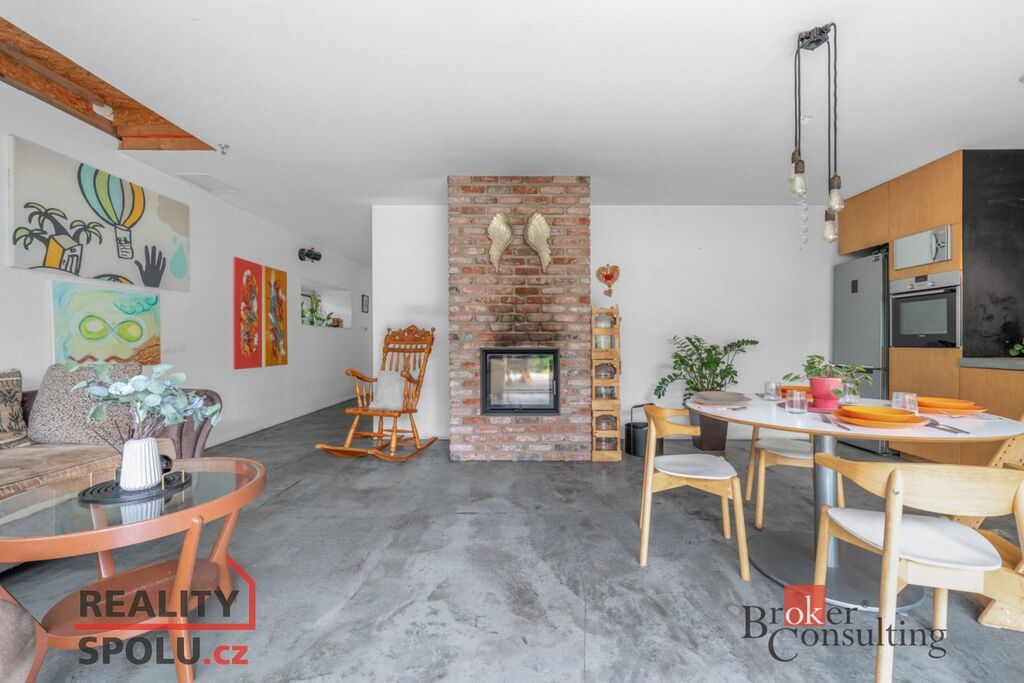 Podlahová plocha 129 m² v přízemí – otevřený prostor s kombinací betonu a sádrokartonu, který působí moderně, čistě a reprezentativně.