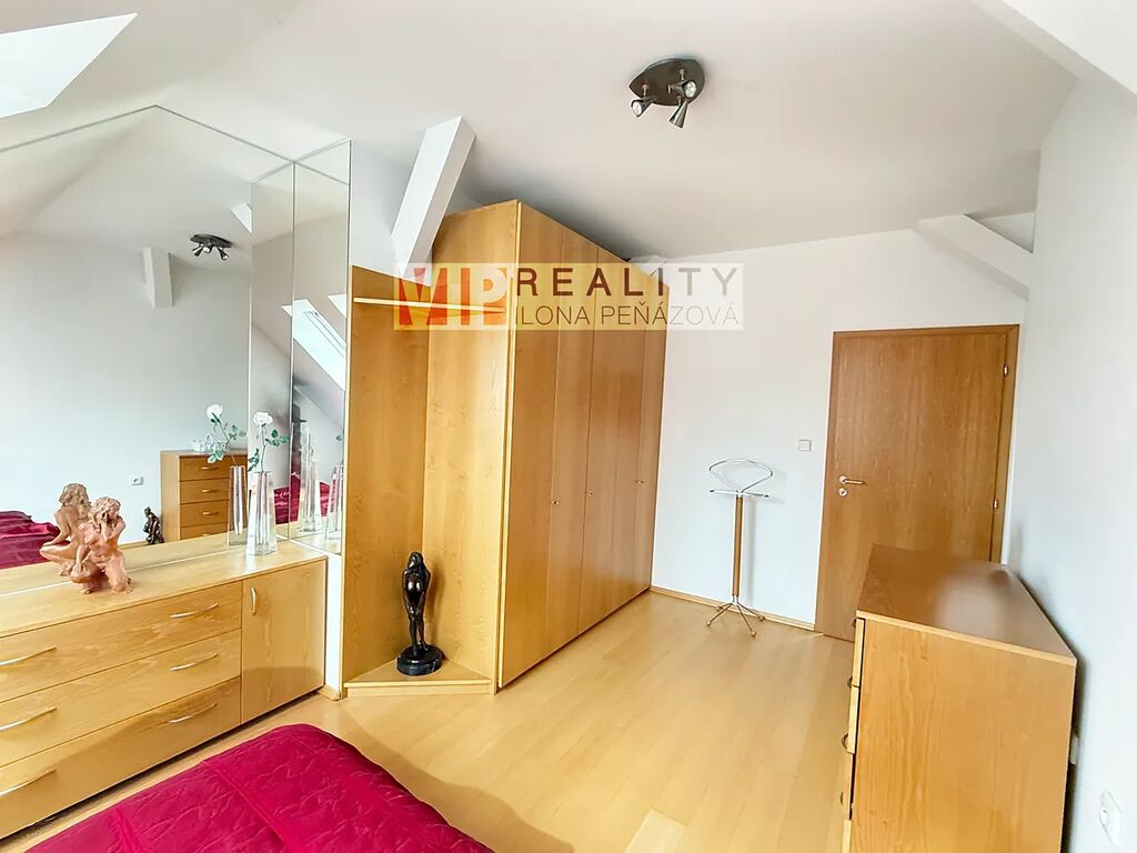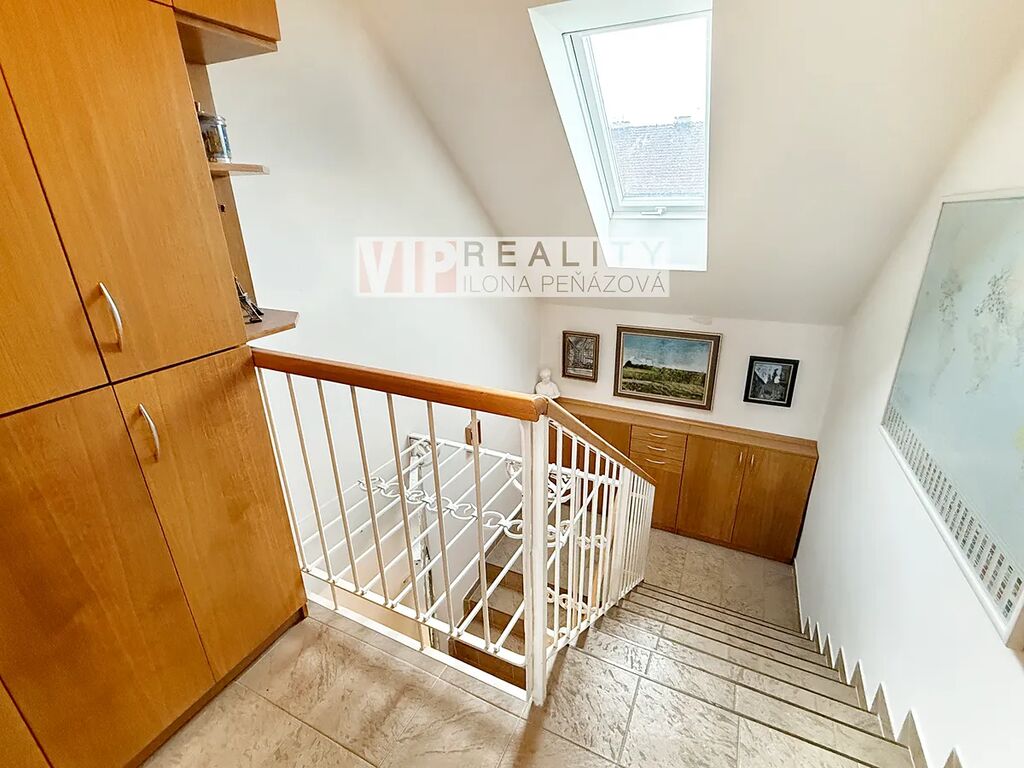 Byt má samostatný vstup do patra, který zajišťuje klid a soukromí. Dominantou je prostorná předsíň, ze které vedou vstupy do jednotlivých místností – pokoje, ložnice, velké koupelny s WC a především do rozsáhlé obytné místnosti, která propojuje obývací pokoj, kuchyni a jídelnu. Celý prostor působí vzdušně a příjemně díky velkým rozměrům a světlosti.