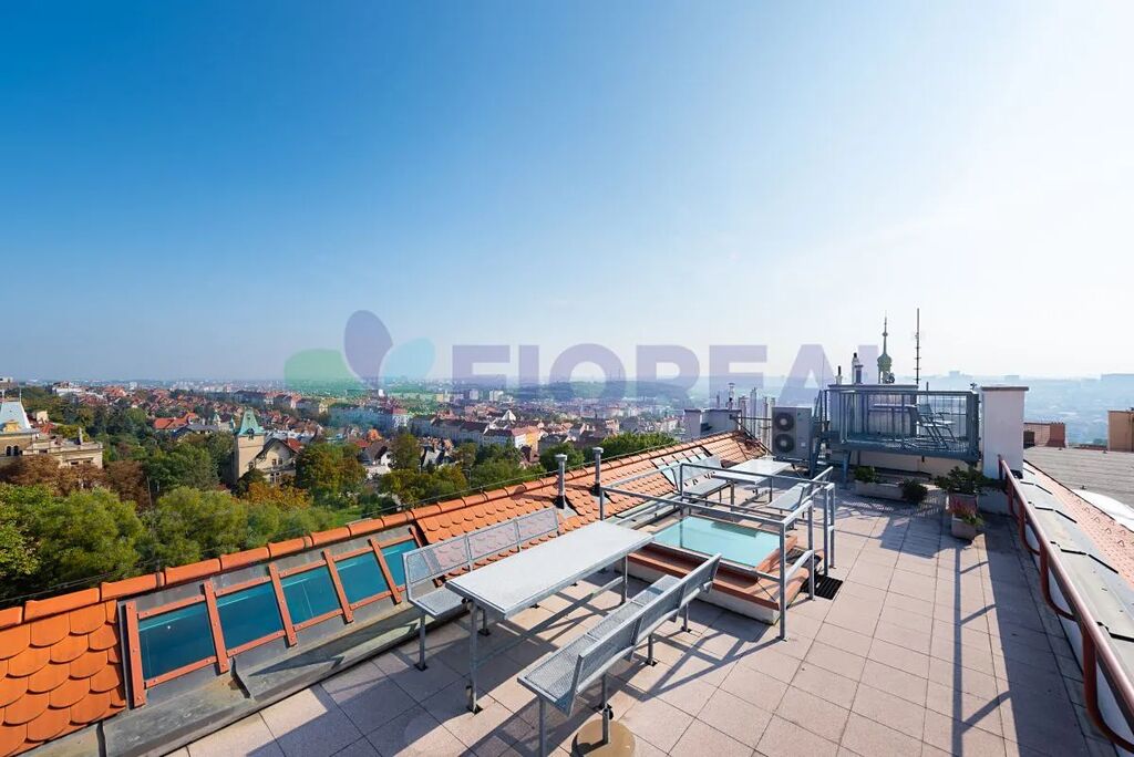 Byt má přístup na střešní terasu, ze které je panoramatický výhled na Prahu s možností posezení a odpočinku ve vyhrazené části 45 m². Byt se pronajímá jako částečně zařízený, je zde kuchyňská linka, pračka a sušička. V tomto bytě je pouze kuchyňská linka, pračka a sušička. Reprezentativní a udržovaný dům s přístupem na čipy se nachází v klidné ulici s vynikající dostupností na metro Náměstí Jiřího z Poděbrad (6 minut) či tramvaj (3 minuty) a kromě bytové plochy, balkónů či terasy nabízí možnosti odpočinku či práce v unikátní privátní zahradě ve vnitrobloku. Lokalita je umístěna do spádově oblasti prestižní školy v Kladské ulici, kam to budou mít vaše ratolesti jednu minutu chůze.