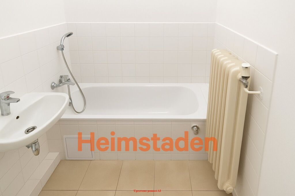 Koupelna je po rekonstrukci, obložená vkusnou dlažbou a vybavená vanou. Praktickým bonusem je prostorná komora i původní vestavěné skříně v předsíni, které poskytují dostatek úložného prostoru.