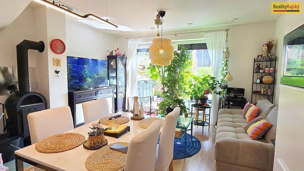 Příjemnou atmosféru obývacího pokoje dotváří nejen krbová kamna, ale hlavně přímý vstup na terasu s menší zahradou.