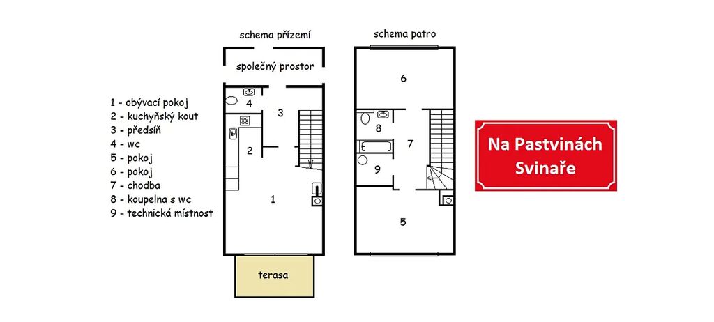 V patře, kde je klidová část, jsou dva samostatné pokoje, koupelna společná s wc a technická místnost.