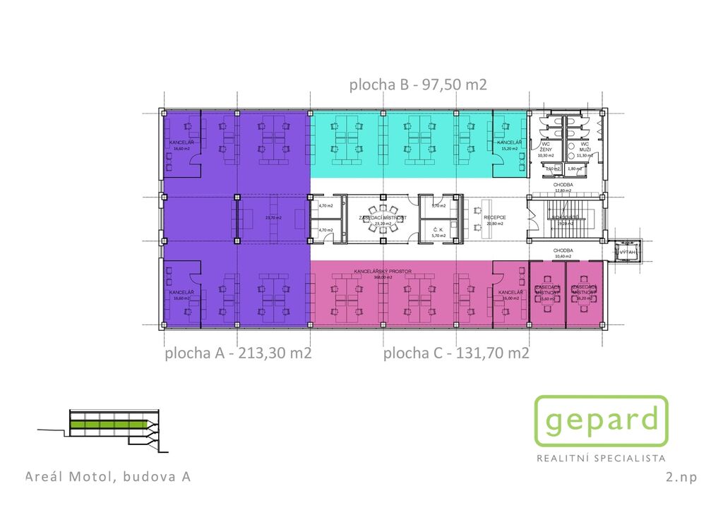 V případě zájmu je možné pronajmout jednotlivě další části tohoto patra: 213 m2 (plocha A) a 131 m2 (plocha C) nebo celé patro dohromady.
