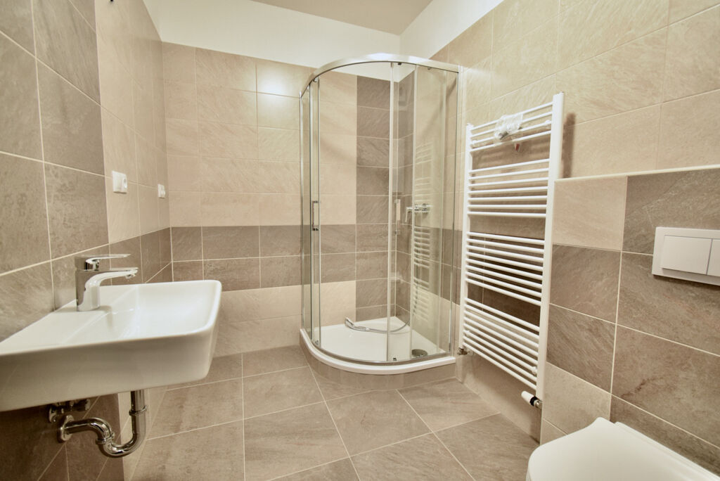 Byt se nabízí částečně vybavený. Kuchyňská linka disponuje vestavěnou lednicí s mrazákem, myčkou, mikrovlnnou troubou, elektrickou troubou, sklokeramickou deskou a digestoří. V koupelně je sprchový kout, umyvadlo se zrcadlem a toaleta.