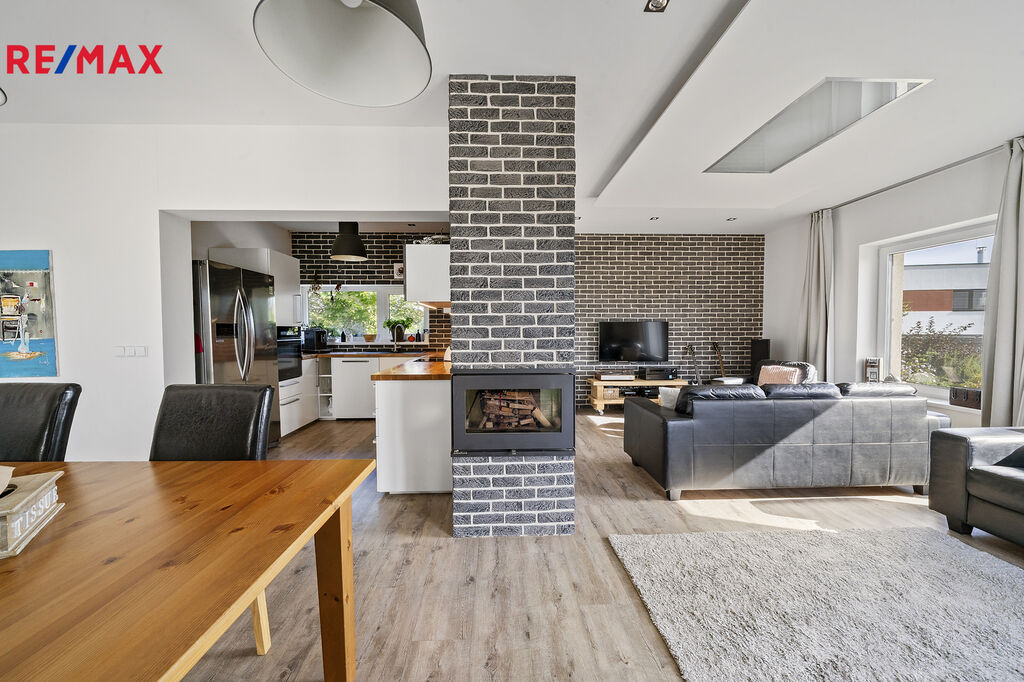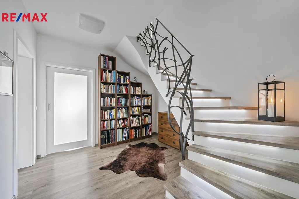 Při vstupu do domu vás čeká praktická předsíň se šatní skříní a vstupem do technické místností, z předsíně se vchází do vstupní haly, kde je dominantou schodiště vedoucí do patra. Každý schod je osvětlený. Schodiště zdobí zábradlí vyrobené uměleckým kovářem na míru. Z haly je vstup do koupelny s WC, sprchou a bidetem a menšího pokoje, který slouží jako pracovna nebo pokoj pro hosty. Z haly se vchází do srdce celého domu, které tvoří vzdušně propojenou kuchyň, jídelnu a obývací pokoj. Středobodem celého prostoru je krbová vložka na kterou je vidět ze tří stran. Obývací pokoj zdobí cihlové obložení stěn s přípravou pro audio. Kuchyň (IKEA) s masivní dubovou pracovní deskou na míru, nechybí příprava na výrobník ledu. Z obývacího pokoje vedou francouzská okna na velkou terasu o výměře 30 m² ze sibiřského modřínu. Z terasy je pohled na krásně upravenou zahradu plnou květin a nabízí tak příjemné posezení s výhledem na Hradec Králové a Orlické hory. Za domem je malé posezení u ohniště a prostor pro sekání dříví do krbu.