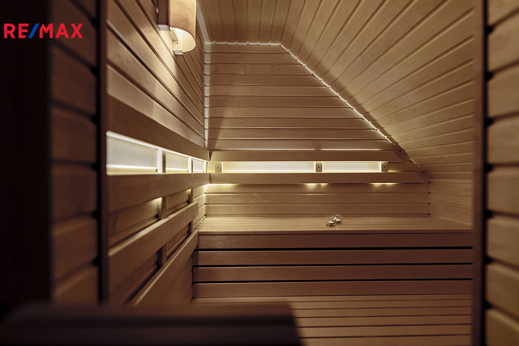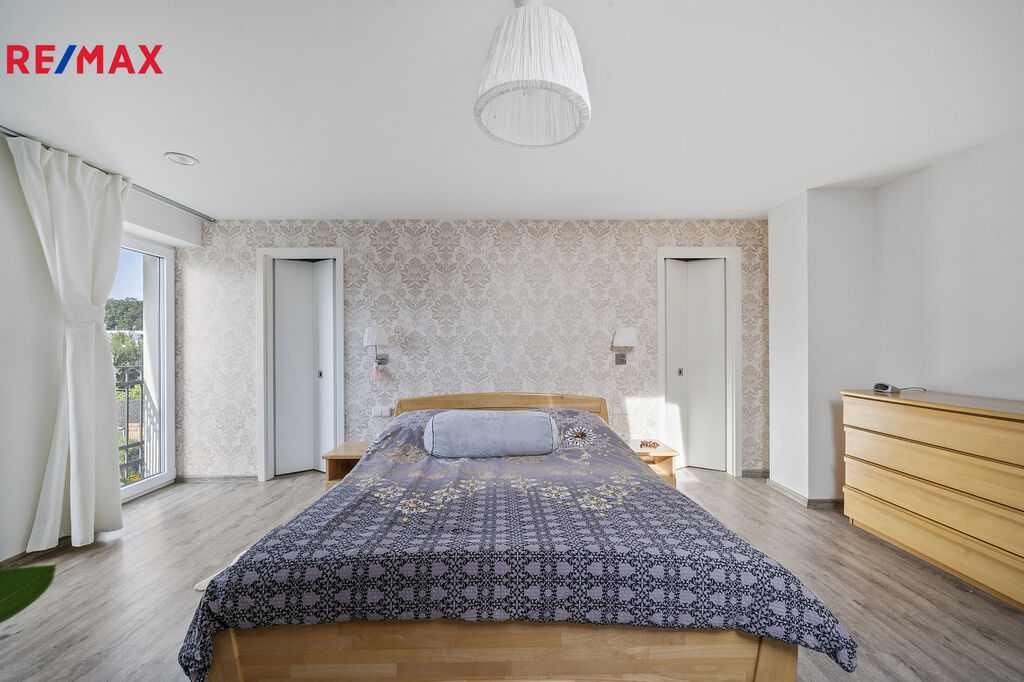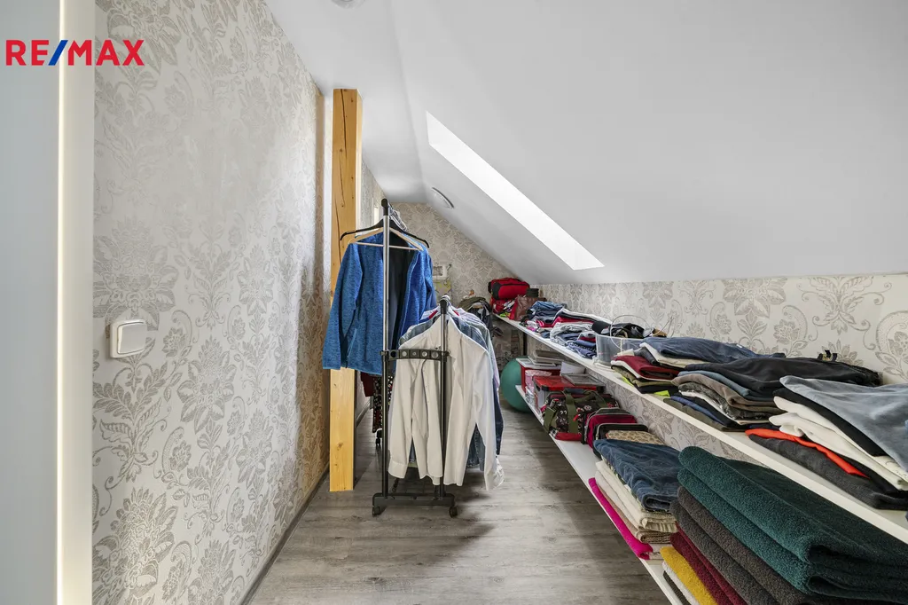 V patře domu jsou dva samostatné a prostorné pokoje, hlavní ložnice, kde každý pokoj má vlastní šatnu. Šatnám dodává světlo střešní okna. K dispozici je také samostatné WC a luxusní koupelna s vanou, sprchovým koutem, dvojumyvadlem a profesionální finskou saunou. Součástí domu je i půdní prostor přístupný skládacími schody, využitelný jako úložný.