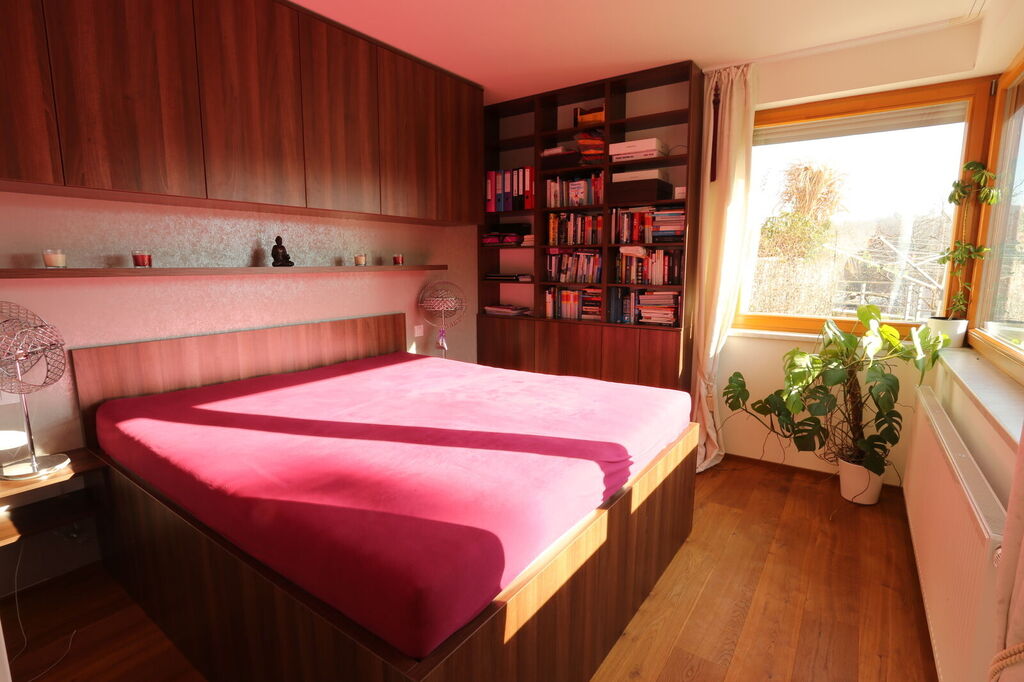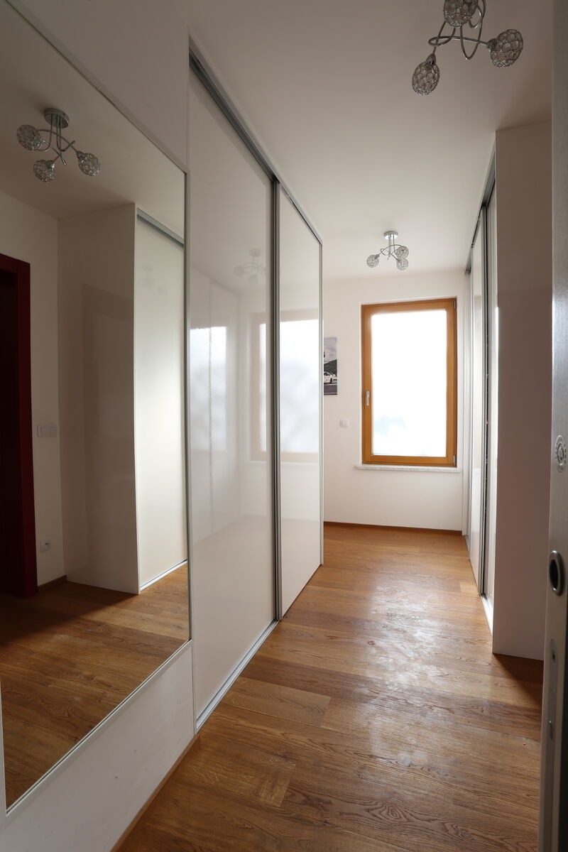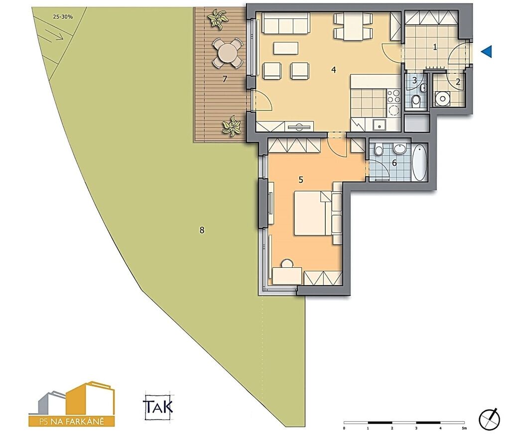 Dispozici bytu tvoří obývací pokoj s kompletně vybavenou kuchyní, televizní stěnou a přímým vstupem na zahradu, dále pak prostorná šatna s vestavěnými skříněmi na míru, koupelna s vytápěnou podlahou a zabudovaným sprchovým koutem a ložnice s nábytkem a postelí na míru. Ve vstupní hale se nachází vestavěné skříně, samostatná toaleta a komora s přípojkou na pračku.