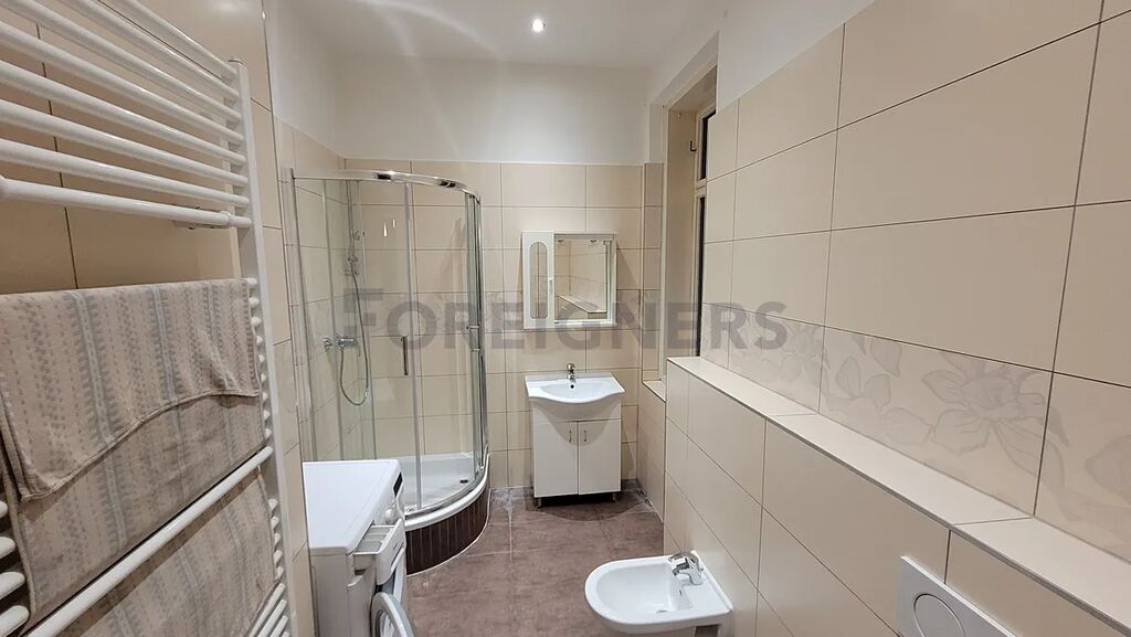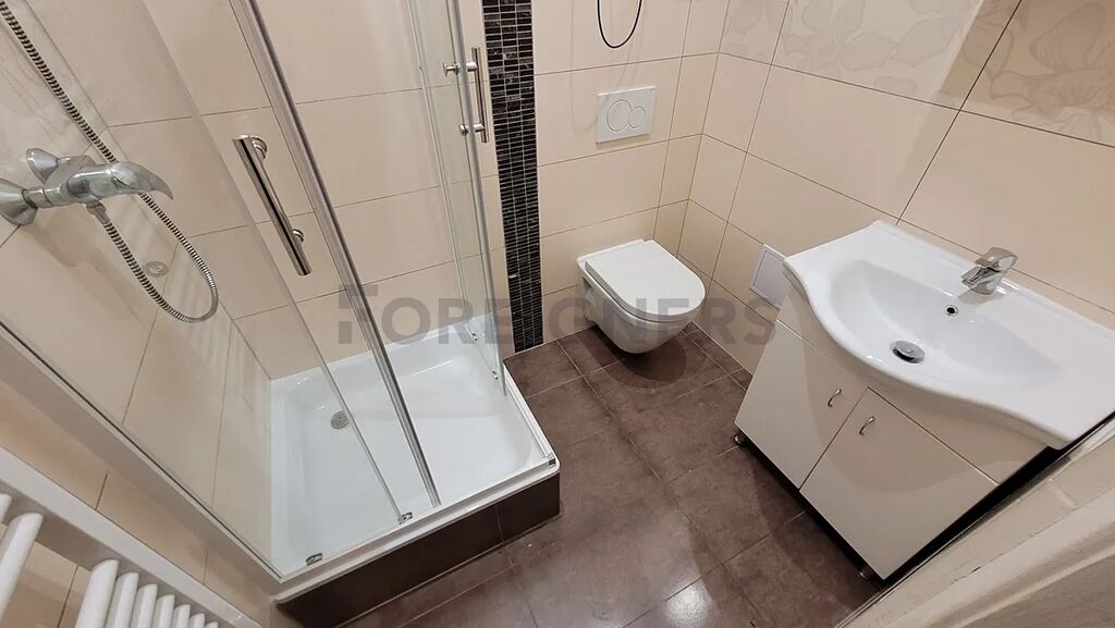 Byt má dvě koupelny – první je vybavena sprchovým koutem, pračkou, umyvadlem a toaletou, druhá nabízí sprchový kout, umyvadlo a toaletu.