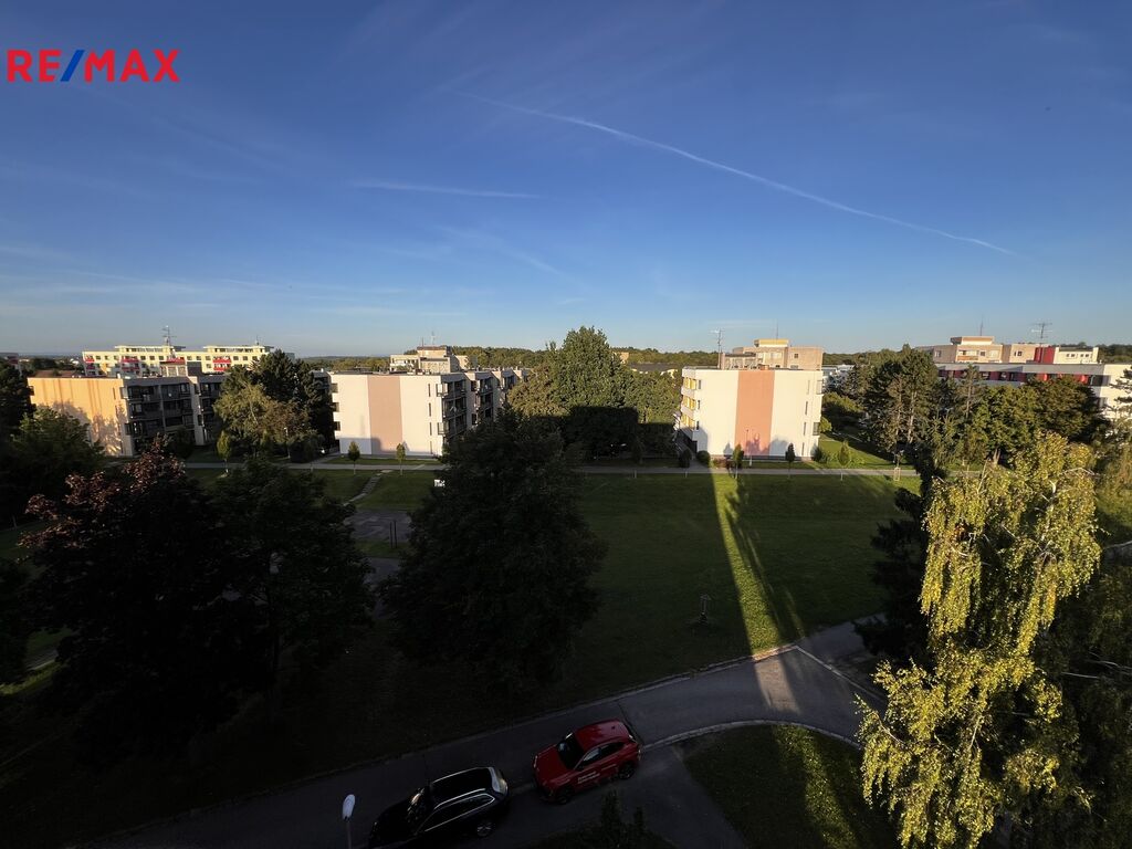 Z balkónu se otevírá krásný výhled do okolí – ideální místo pro klidné bydlení s pohodlím města.