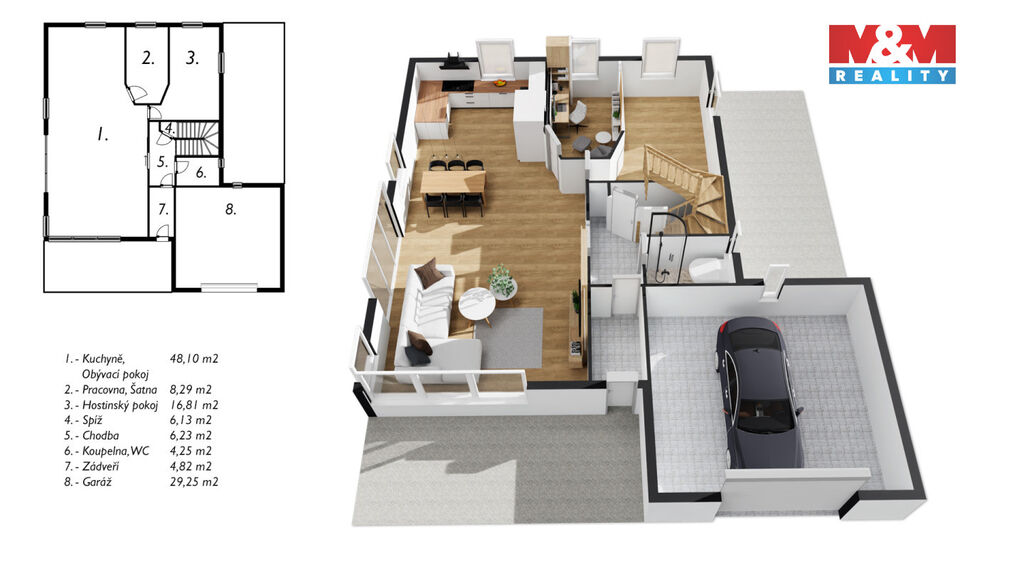 Exkluzivně pro Vás k prodeji výjimečný rodinný dům v klidné části obce Mořina na Berounsku, jen pár minut od okraje Prahy. Tento samostatně stojící dům, situovaný v nádherné lokalitě, je ideální pro vícegenerační bydlení či klidný rodinný život. Nemovitost se rozkládá na pozemku o velikosti 1302 m² a nabízí prostornou užitnou plochu 240 m². Dům má dvě nadzemní podlaží a jedno podzemní, celkem 6 místností, včetně průchozí šatny a komory. Velké a světlé pokoje poskytují jedinečný výhled do okolní malebné krajiny. K dispozici je také sklep a prostorná garáž s dílnou. Obývací pokoj má přímý vstup na zahradu o rozloze více než 1000 m². V obci a blízkém okolí je dostupná veškerá občanská vybavenost. Skvělá investice díky velikosti pozemku a unikátní poloze. Využijte jedinečnou šanci bydlet v přírodě, klidu a přesto na dosah všeho, co potřebujete k modernímu bydlení. Velmi rádi také pomůžeme s financováním od našeho specialisty. Těšíme se na Vás v obci Mořina na Berounsku.