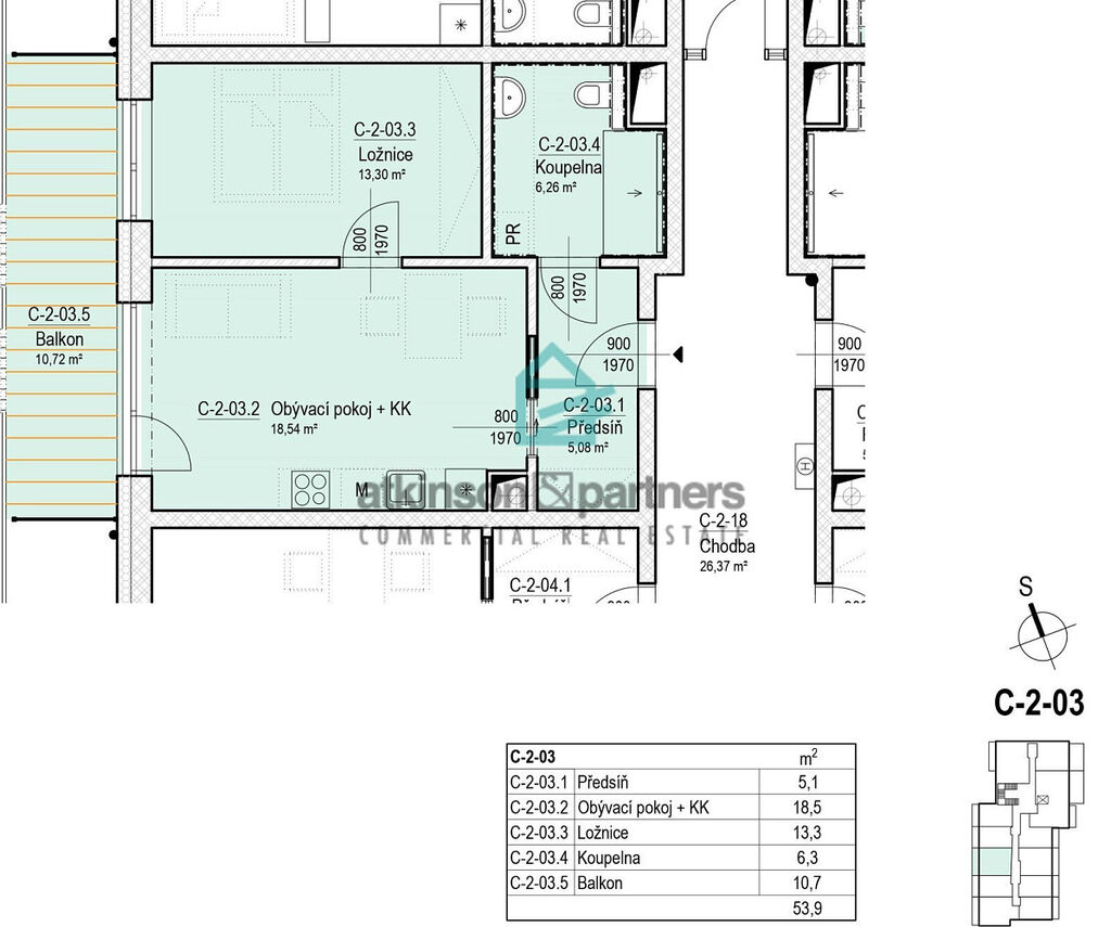 Jedná se o praktický byt o dispozici 2+kk nacházející se ve 2. NP budovy C. Stejně tak jako všechny ostatní bytové jednotky je i tato koncipována jako bezbariérová. Její podlahová plocha činí 43,2 m² a disponuje balkónem o výměře 10,7 m².