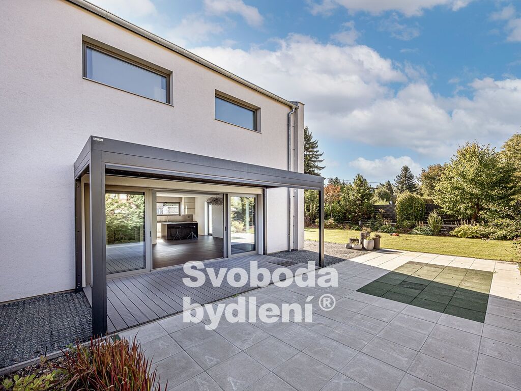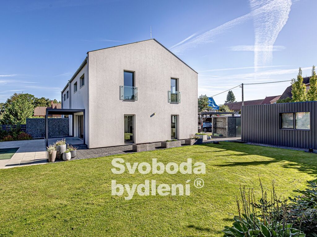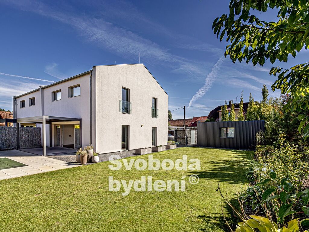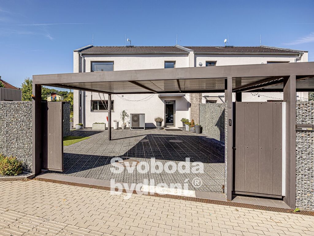 Technické informace: Pozemky celkem 678m2, z toho zastavěná plocha 89m2 + 21m2, užitná plocha domu 161m2. Dům postavený z YTONGu, zatepleno 20cm polystyrenu včetně izolace proti vzniku tepelných mostů, Energetická třída B, střešní krytina Tondach - černá pálená taška, hliníková okna i dveře s izolačním trojsklem, mramorové parapety, zavedena voda, elektřina i kanalizace (plyn není zaveden), vytápění tepelným čerpadlem voda/vzduch s vnitřním modulem (all-in-one) NIBE VVM320, podlahové vytápění v obou podlažích, jednotka v zimě topí a v létě chladí; sanita Villeroy & Boch, vodovodní baterie Hansgrohe, Internet/wifi modem; podlahová krytina v 1. NP je velkoformátová (90x90cm) italská dlažba, ve 2. NP plovoucí podlahy; obklady zakončené hliníkovými lištami, všechny interiérové (bezfalcové) dveře mají zapuštěné panty a magnetické jazýčky. Automatická závlaha (kapačka) a robotická sekačka. Na prodej je polovina dvojdomu, domy mají samostatné obvodové zdi a jsou navíc zvukově odděleny polystyrenem. Měsíční náklady na provoz domu jsou cca 5.000,-Kč (elektřina + voda).
