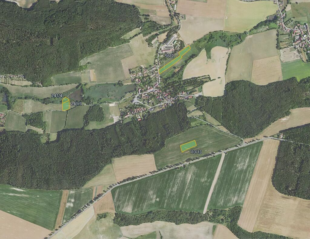 Jedná se o 4 parcely s celkovou výměrou 22 764 m². K prodeji je výlučné vlastnictví na parcele č. 56/2 a podíl o velikosti 1/2 na parcelách č. 113/13, 241/3 a 241/4. Celková výměra prodávaných podílů činí 16 614 m², z toho: