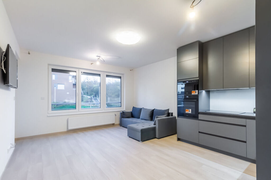 Byt je dokončen ve vysokém standardu, který se vyznačuje kvalitními materiály, nadčasovým designem a důrazem na detail. Součástí vybavení jsou plastová okna s venkovními roletami, bezpečnostní vchodové dveře a nadstandardní obklady a dlažby v koupelně. Prosvětlený obývací pokoj s kuchyňským koutem plynule navazuje na balkon, který poskytuje příjemné místo k odpočinku. Byt působí světlým a vzdušným dojmem, nabízí praktické řešení úložného prostoru a příjemnou atmosféru domova. Dům se právě dokončil a v bytě ještě nikdo nebydlel.