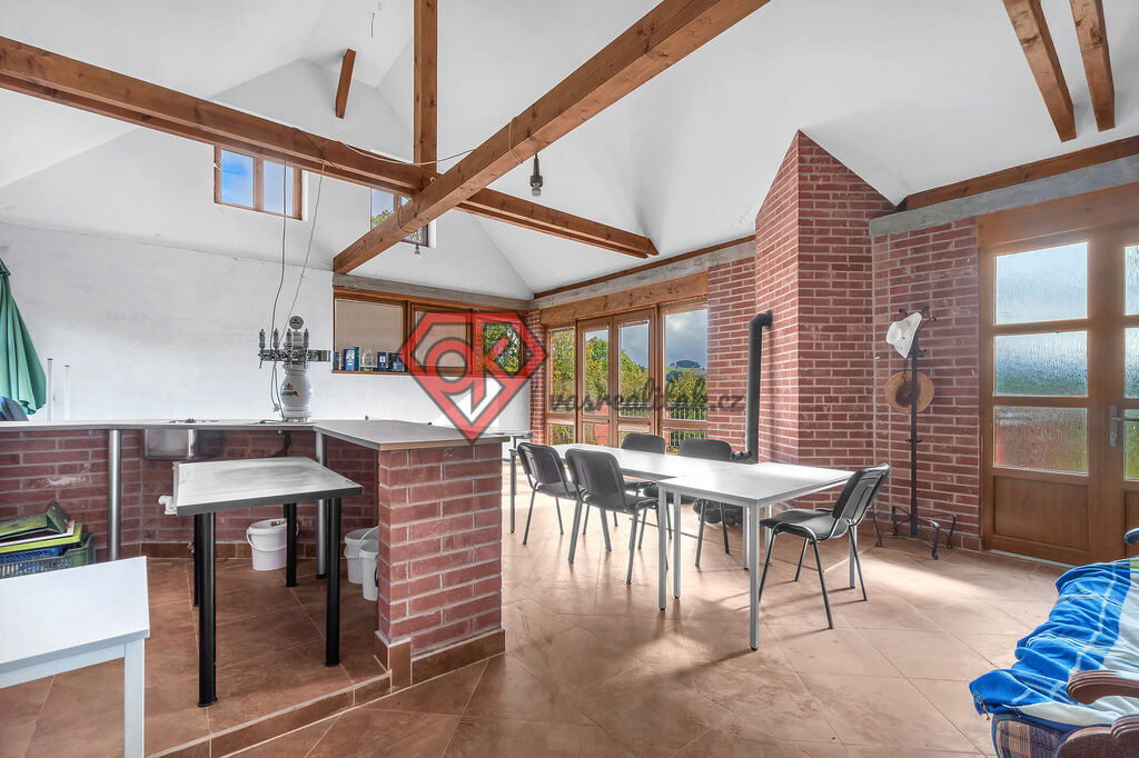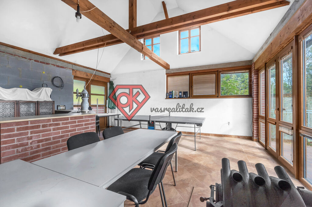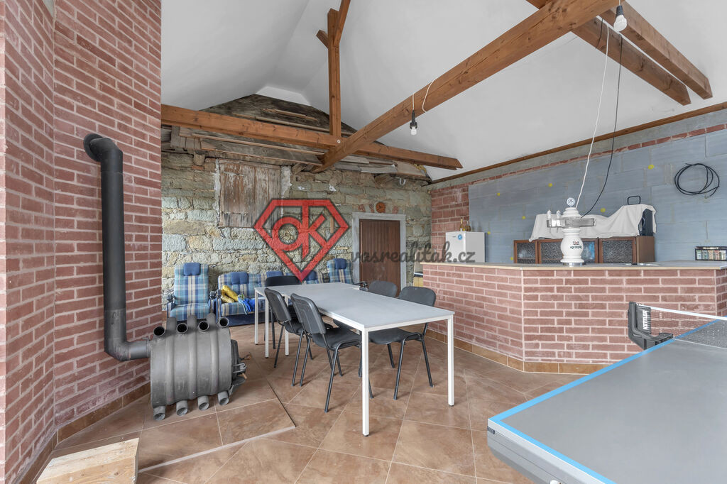 - na pozemku stojí stodola po částečné rekonstrukci, která v sobě ukrývá garáž, prostorný úložný prostor a naprosto skvělou společenskou místnost, kde nechybí ani bar, ping-pong, krbová kamna a vchod na terasu