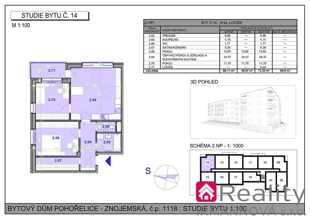 Cena po slevě. Novostavba bytu 3+kk s řízeným systémem měření a regulace vytápění a ohřevu teplé vody, se nachází ve 2. nadzemním podlaží bytového domu s výtahem. Celková plocha bytu je 73,55 m2 včetně lodžie. Podlahová plocha je 70,8 m2. Součástí každé bytové jednotky je klimatizace. Bytový dům obsahuje 42 nových bytových jednotek o vel. 3+kk a 2+kk, 14 sklepních boxů, 3 zděné sklepy, 8 vnitřních garážových stání, kočárkárnu - kolárnu, technické zázemí, 4 samostatné zděné garáže, 40 venkovních garážových stání. Bytový dům nabízí 4. NP a 1. PP.
