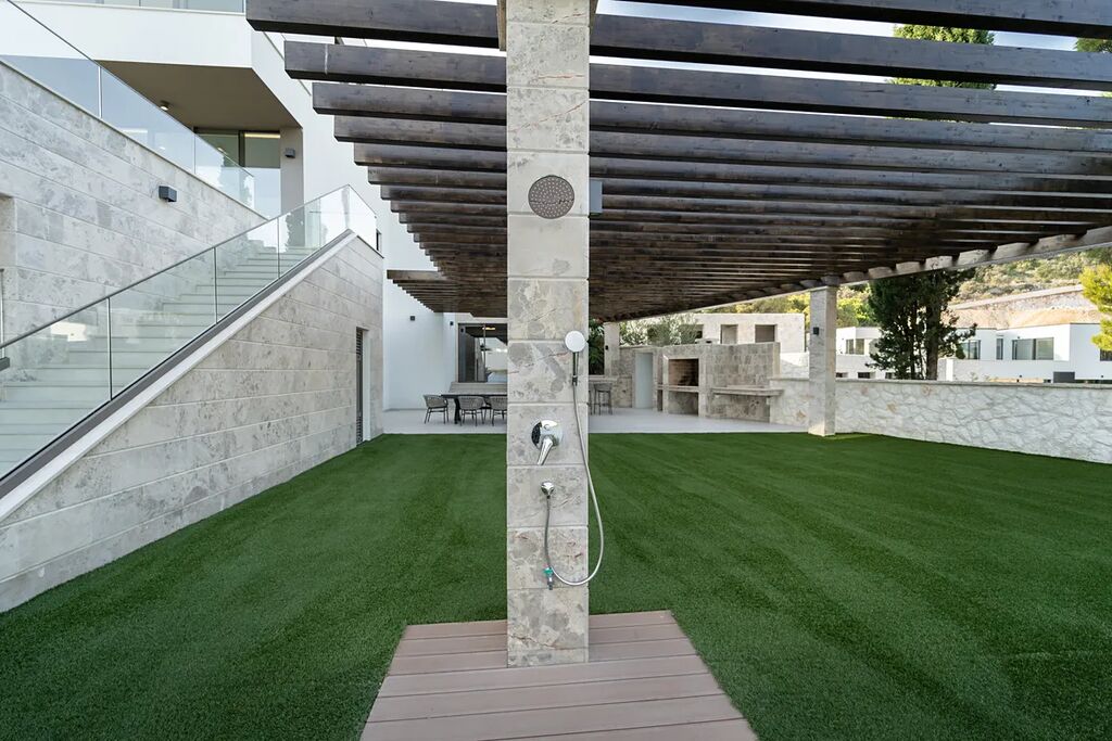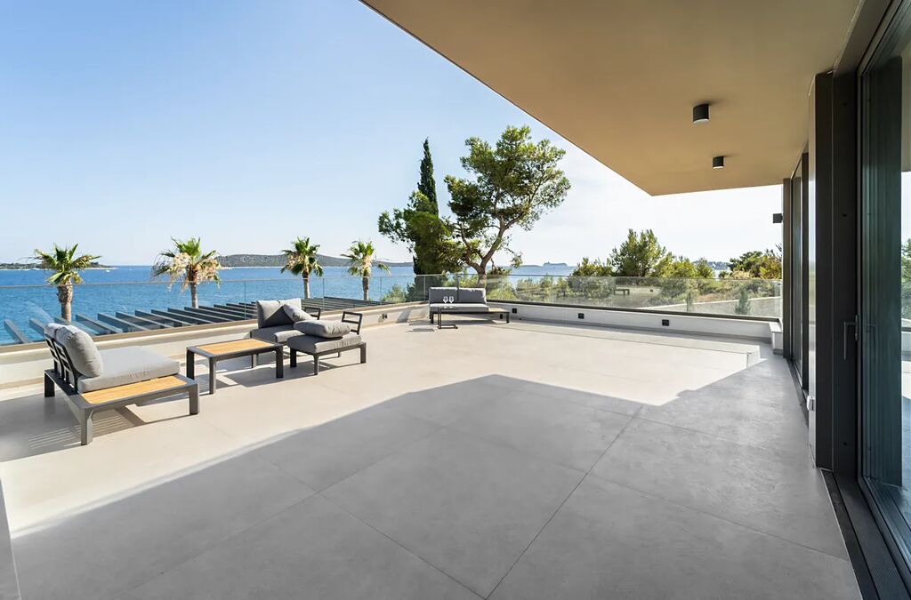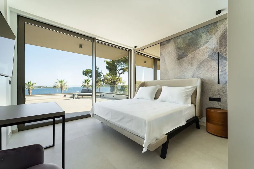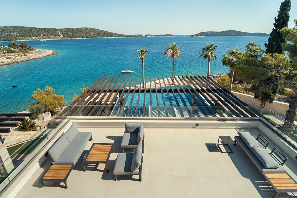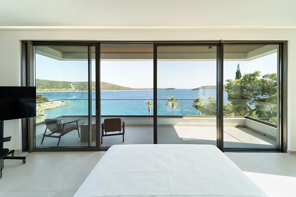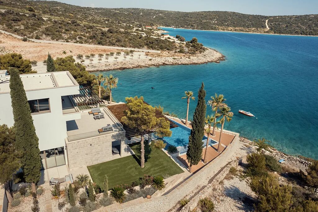 Unikátní luxusní vila s naprostým soukromím přímo na pláži s nádherným výhledem na moře. Hlavní vila má 400 m2 obytné plochy, vedlejší budova (pro hosty) 60 m2 obytné plochy. Domy obklopuje velkorysá zahrada o rozloze 1500 m2. V přízemí vily se nachází působivý obývací pokoj s otevřenou kuchyní a jídelním koutem (49,5 m2), vinotéka 21,6 m2, toaleta pro hosty, atrium (13,6 m2), wellness zóna s finskou saunou, infračervenou saunou a vířivkou (32,5 m2), fitness 22 m2, přímý přístup na velkou terasu s letní kuchyní, grilem a relaxační zónou, 100 m2 velký nekonečný vyhřívaný bazén s protiproudem, terasa pro opalování a relaxaci uprostřed středomořské vegetace. V prvním patře najdete tři pohodlné ložnice s vlastními koupelnami a přístupem na dvě terasy (7,36 m2 a 46,2 m2). Ve druhém patře je soukromá hlavní ložnice s šatnou a koupelnou, terasa s výhledem 50 m2 a další terasa 19,89 m2. Osobní klidová zóna s dechberoucím panoramatickým výhledem na moře a ostrovy. Ve vedlejším domku se nachází kuchyň o obývacím pokojem, ložnicí a koupelnou - ideální msto pro hosty nebo zaměstnance. Vila byla postavena v roce 2025 v luxusním, moderním provedení s použitím vysoce kvalitních materiálů a energeticky úsporných řešení. Obklopena středomořskou zahradou je oázou klidu poskytující absolutní soukromí. Tato úchvatná vila je ideální volbou pro ty, kteří hledají harmonii mezi moderním bydlením a přírodou. Je také skvělým místem pro dovolenou.