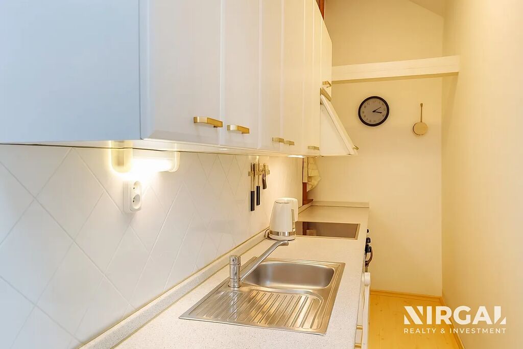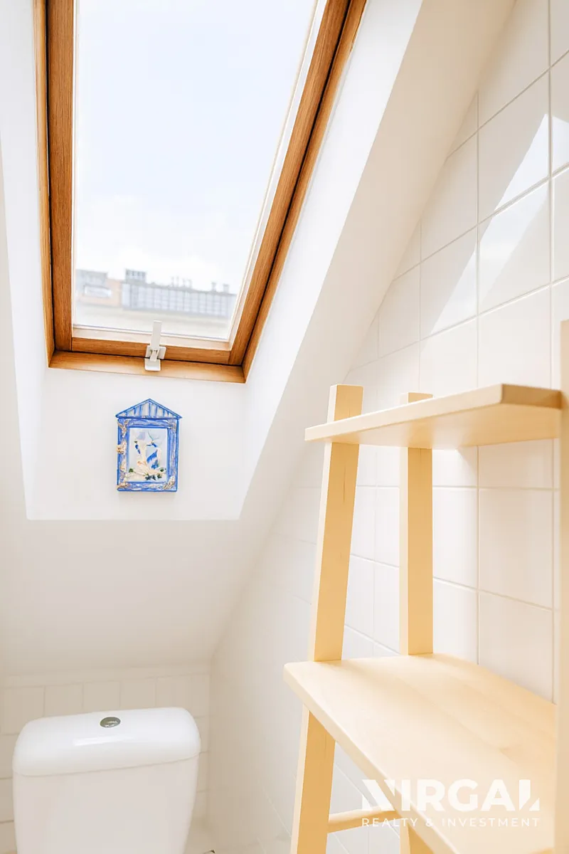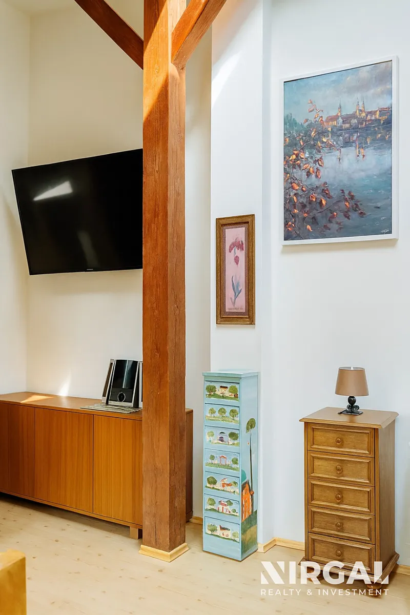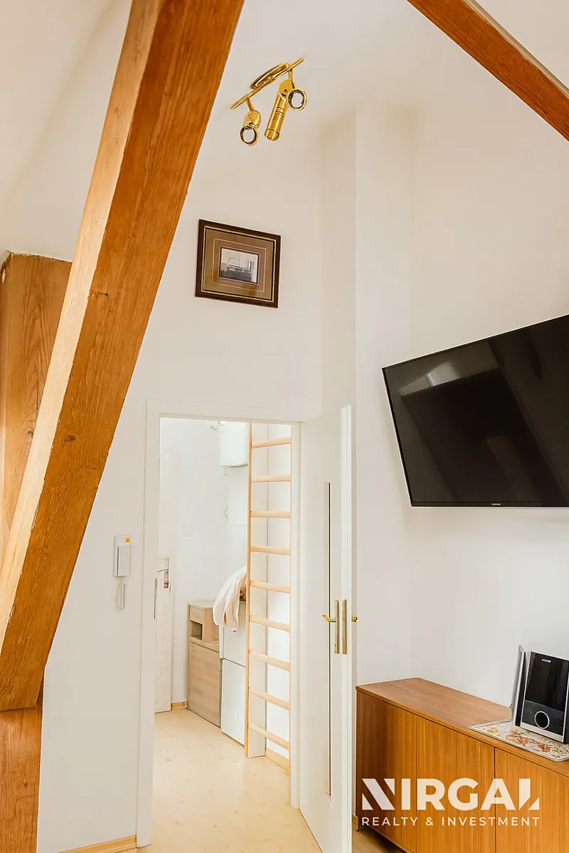 Velký, atypický a plně vybavený mezonet 1+КК (48 m²) se nachází v 4. podlaží kompletně zrekonstruovaného secesního domu se zachovanými původními prvky. Díky poloze v nejvyšším podkrovním patře a střešním oknům je byt mimořádně světlý a vzdušný.