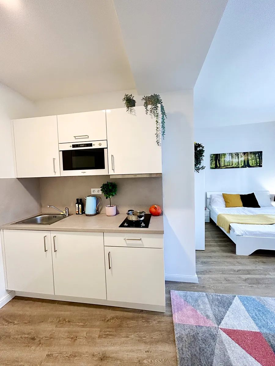 Byt o dispozici 1+kk je plně zařízen a připraven k okamžitému nastěhování. Součástí je kuchyňská linka včetně vestavných spotřebičů, pohodlný rozkládací gauč, jídelní stůl se židlemi, postel, úložné prostory a koupelna se sprchovým koutem. Interiér byl navržen s důrazem na funkčnost a nadčasový design.